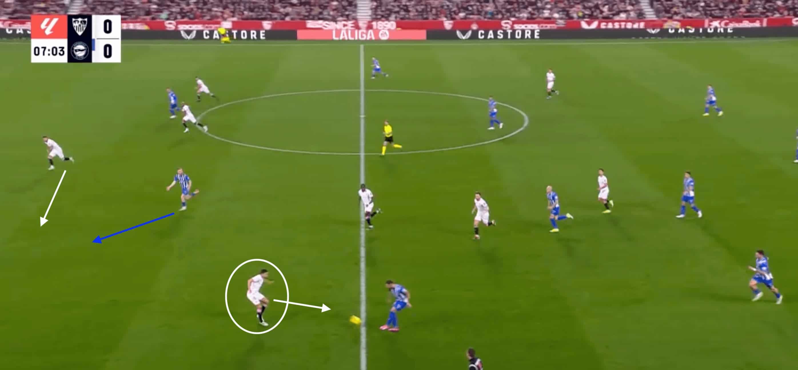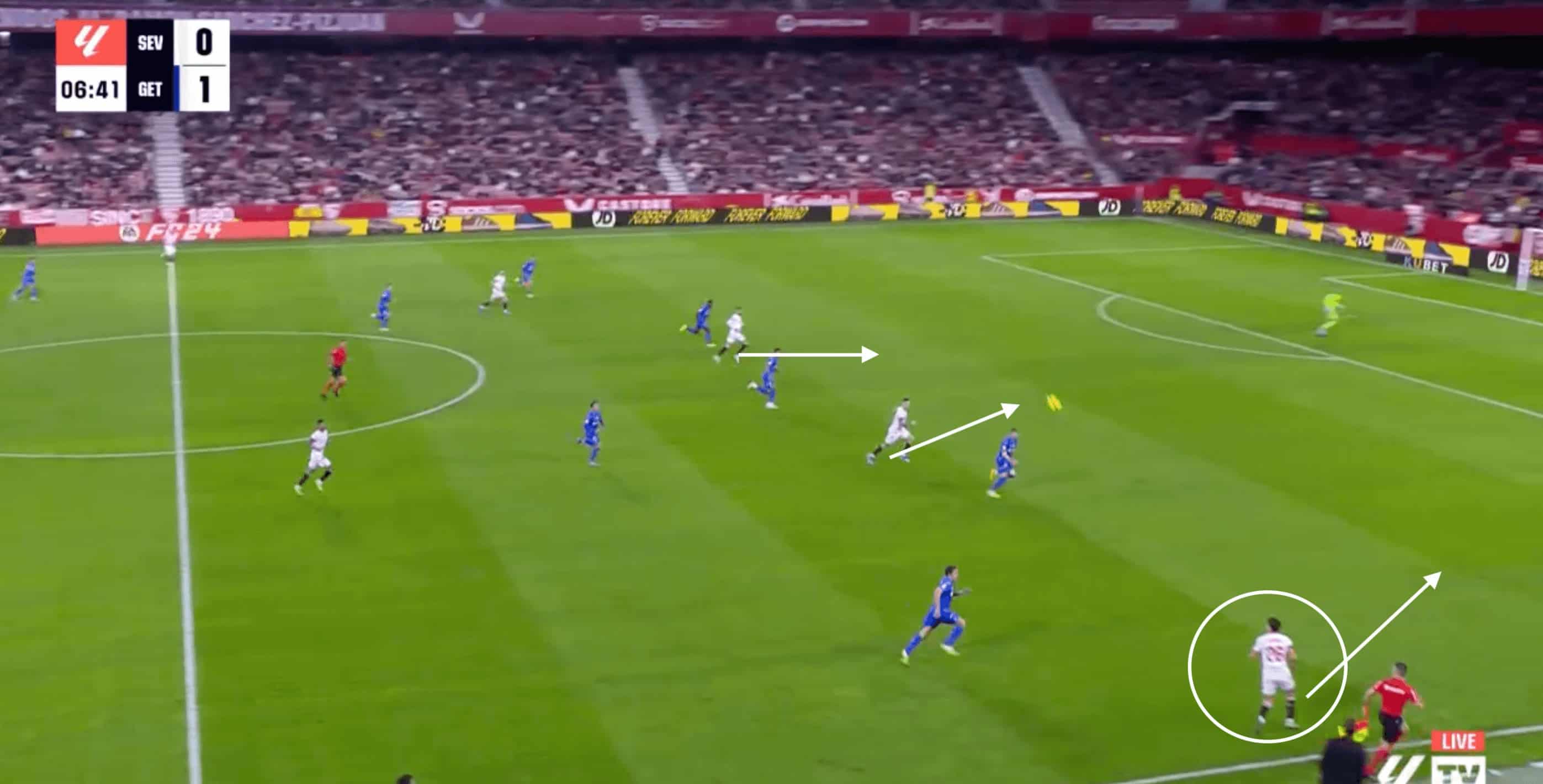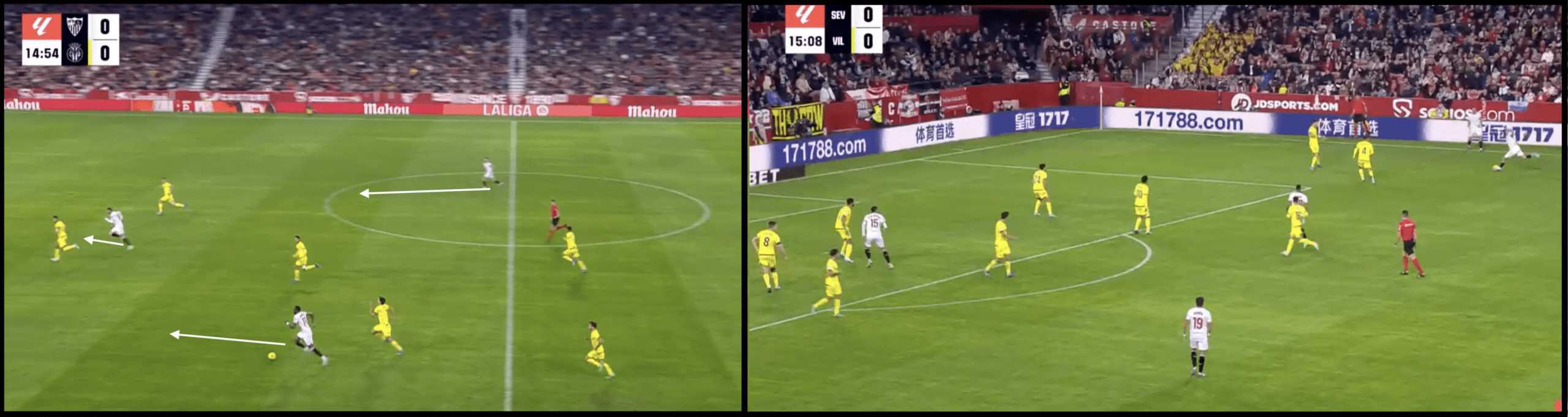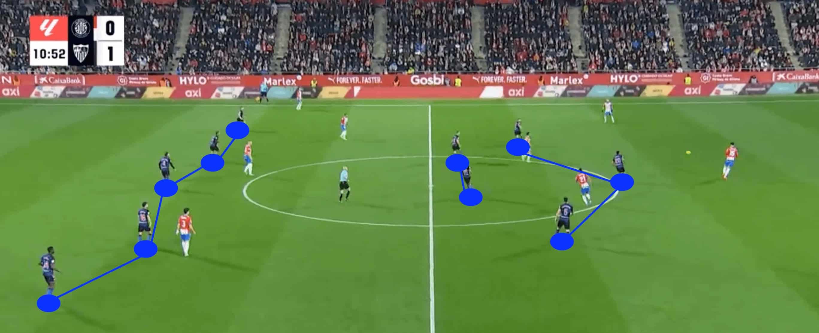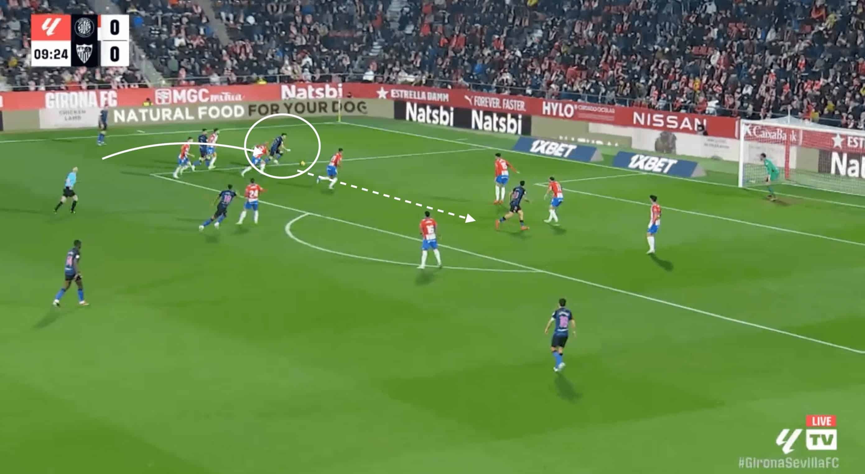 When the communication between defenders is poor, this system has its glaring flaws. In Sevilla’s most recent match against Girona, Navas is caught centrally, with Ocampos unable to close down the pass into Savio out wide. As a result of Nianzou’s failure to cover the wider area, Sávio was able to use his speed and technical ability to penetrate the box and assist Dovbyk for the equaliser.