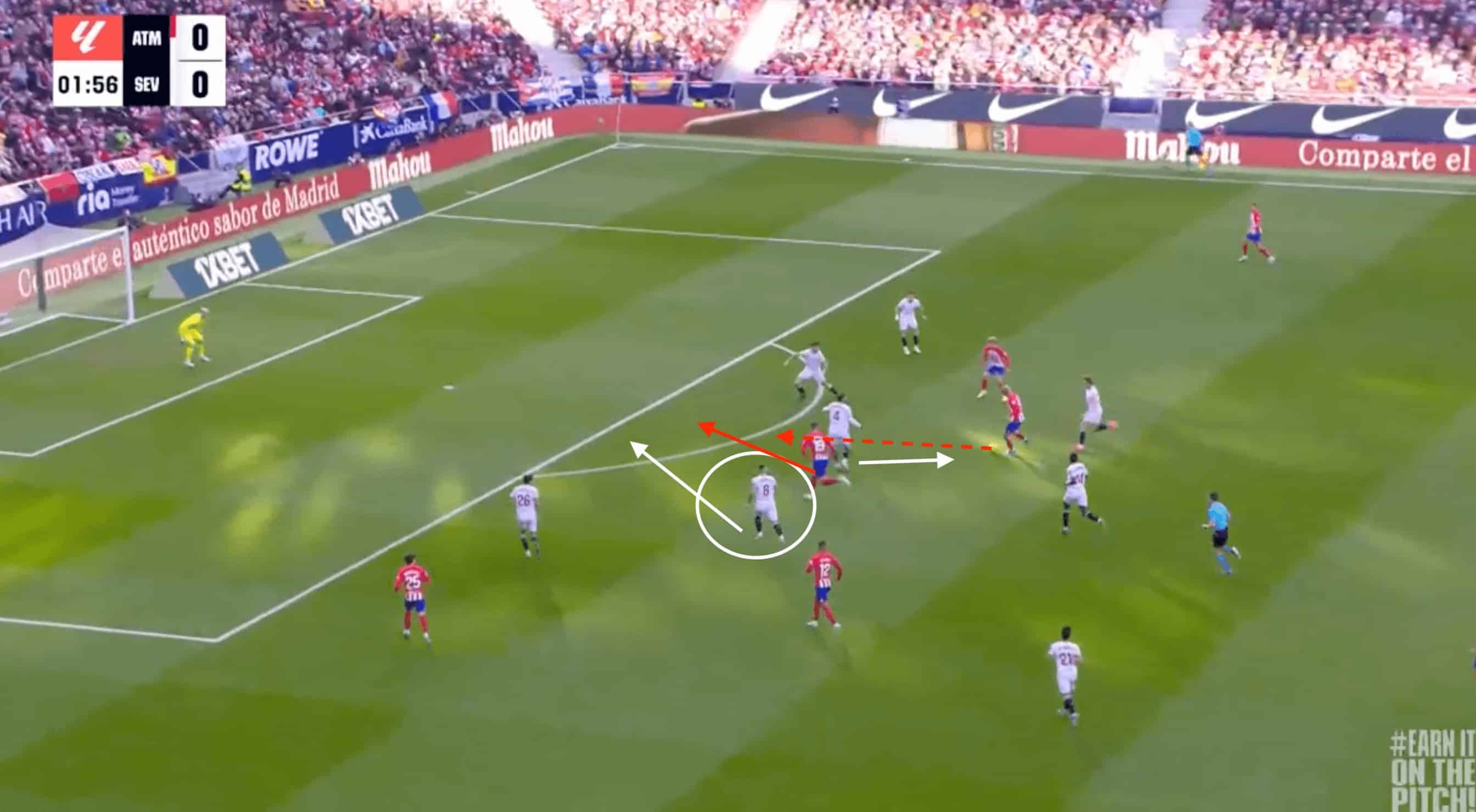 Despite the added support from a deeper-lying single pivot often deputising in defence, Sevilla has still been vulnerable at the back. As shown in their match against Atletico Madrid, Ramos jumps out to press Rodrigo De Paul, but the poor positioning from Gudelj creates an imbalance with only three players in the defensive line.