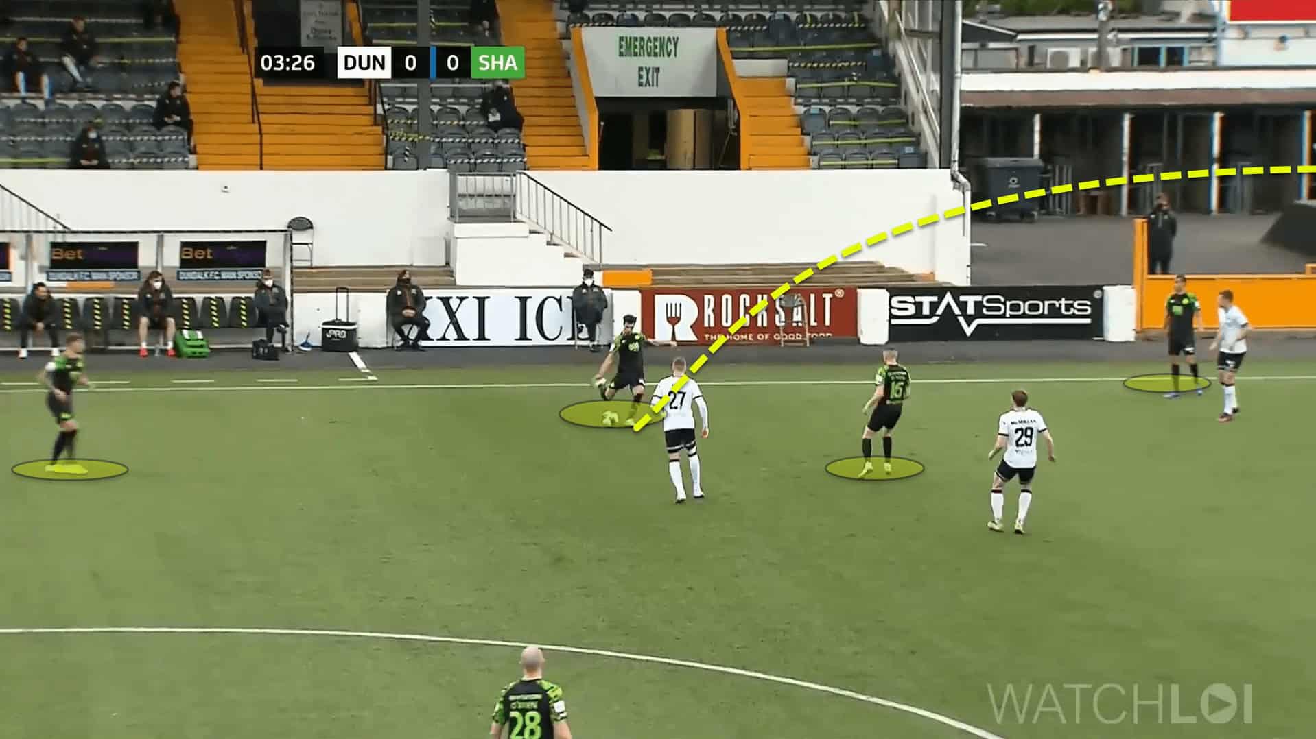 Here is an example of how Bradley set Shamrock Rovers up in the build-up phase in a recent match against Dundalk in the League of Ireland in full view. Rovers managed to progress from the build-up phase into the consolidation phase – the phase where the team has established possession in the middle third of the pitch – rather easily.