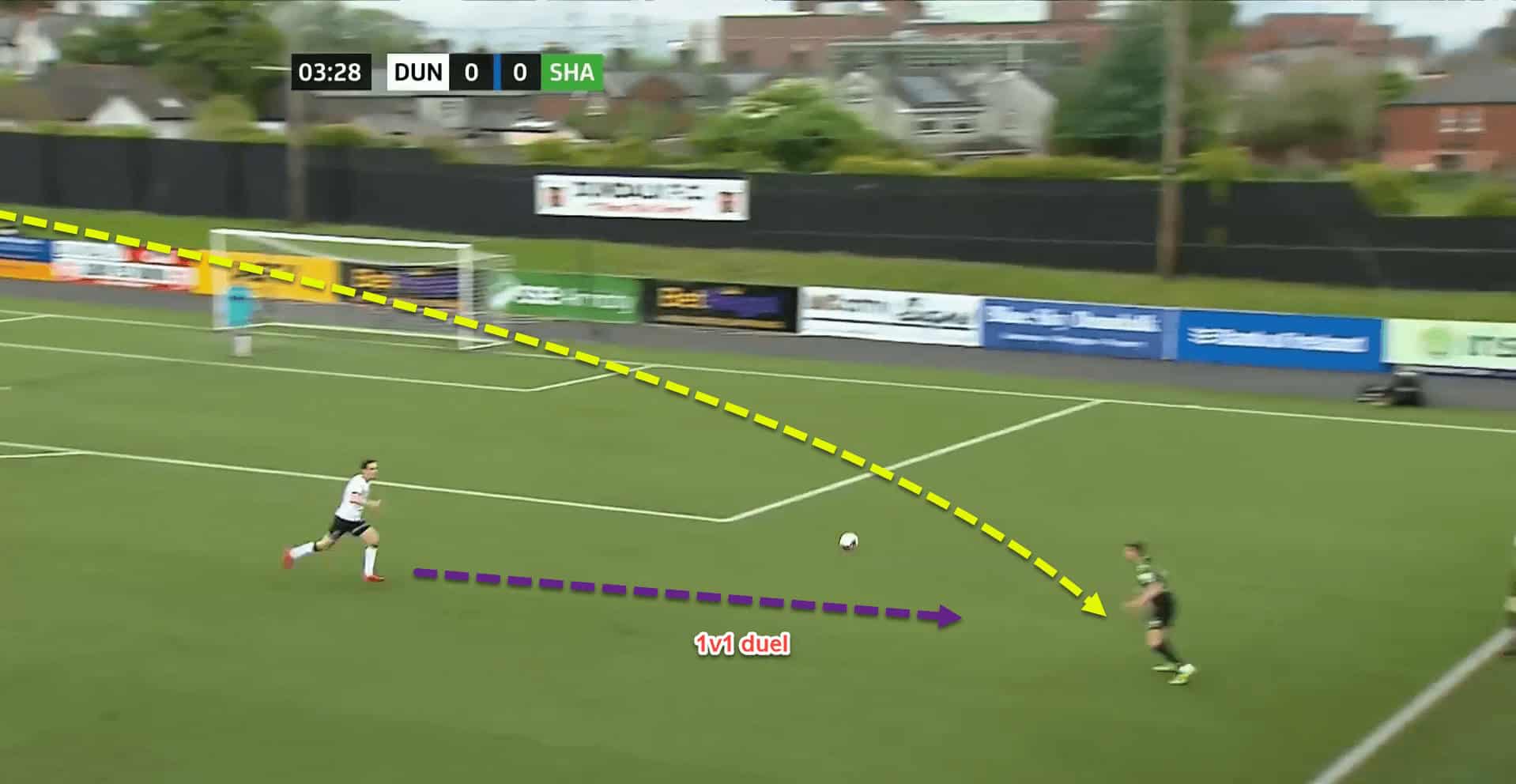 Now we can take a look at this in a real-time example from Rovers’ game against Dundalk. They created a wide overload to drag Dundalk’s defensive block across before quickly switching it to the free right wingback, Gannon, on the far side. It is always the wingbacks who are free due to the nature of the 3-4-2-1 and 3-4-1-2 formations.