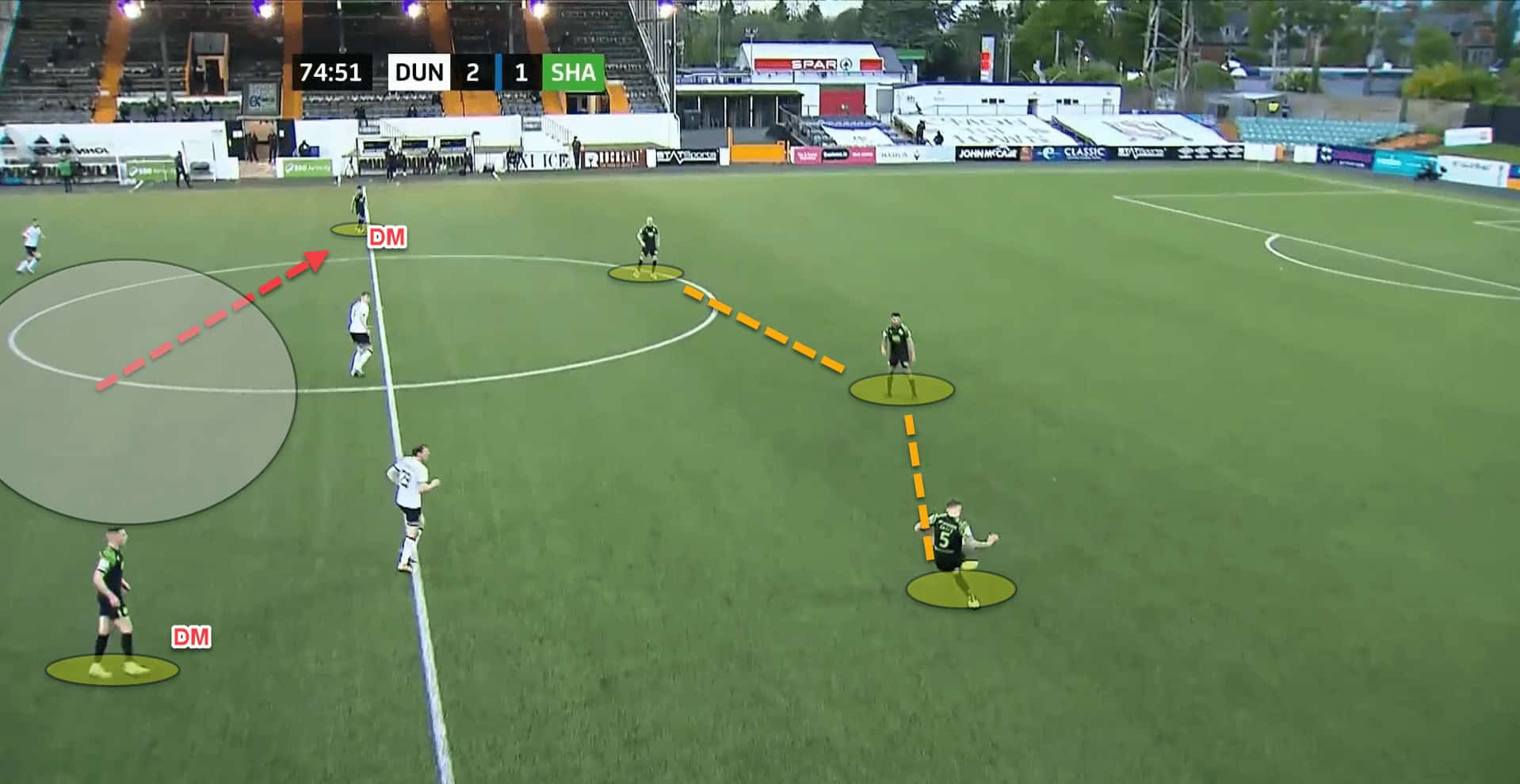 Here, we can see an example of Shamrock Rovers overloading the flank with five players. Two players, the centre-forward and the pivot player sitting behind the ball-carrier are occupying positions in the halfspace whilst the Scales (left wingback), Finn (other pivot player), and Mandroiu (attacking midfielder) are positioned in the wide channel.