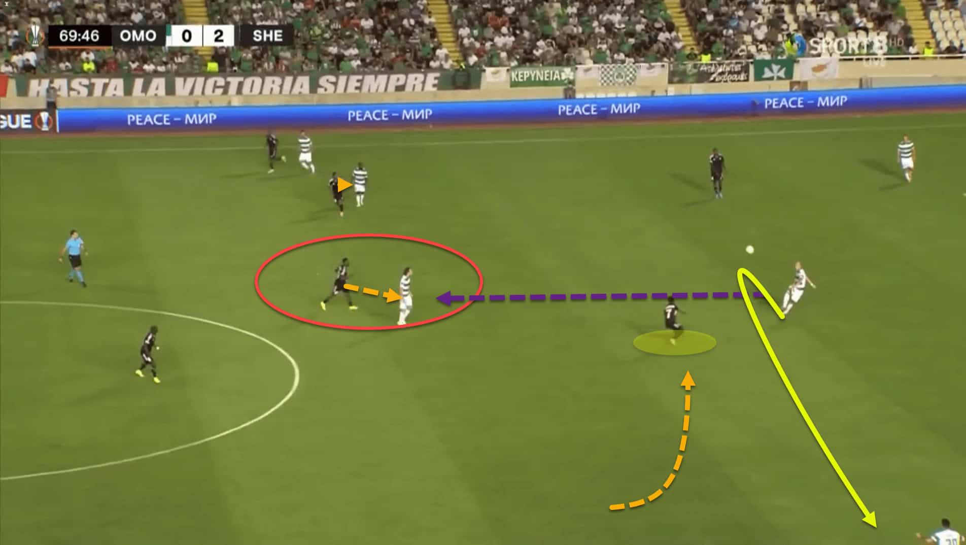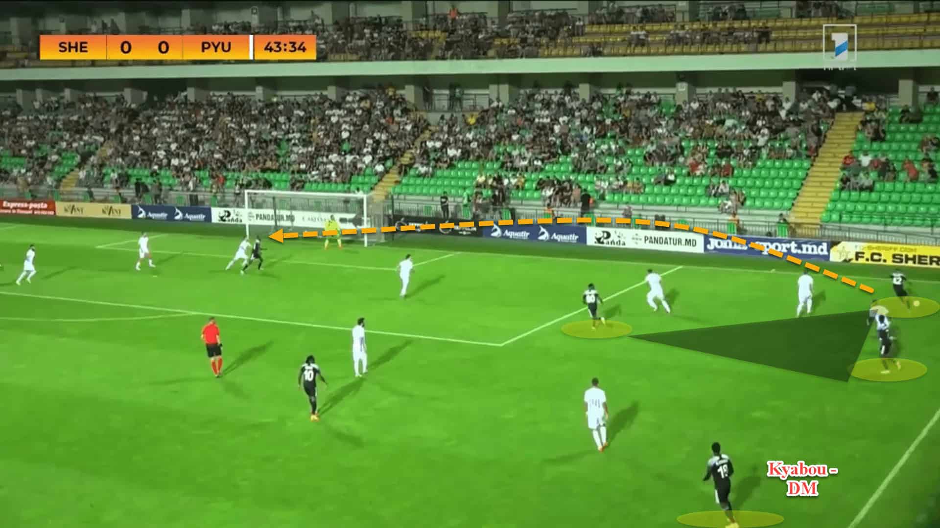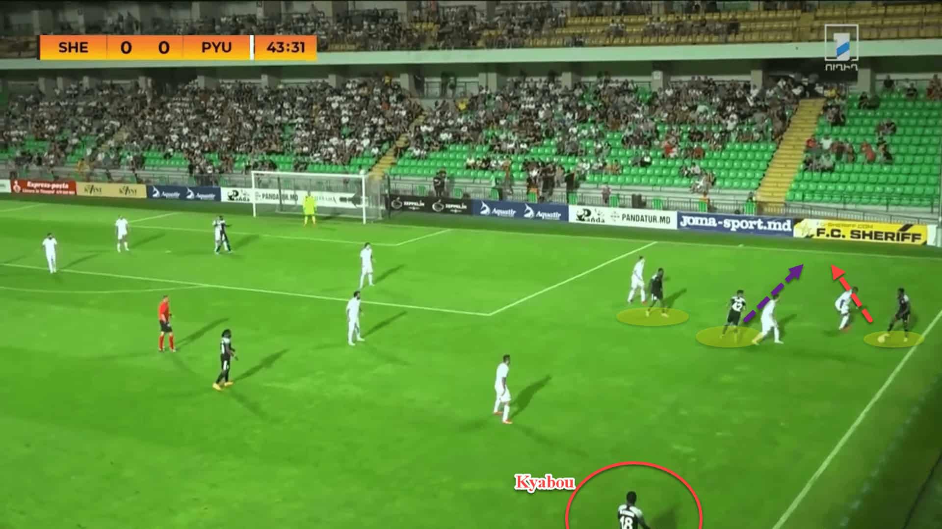 Here, again, Sheriff have created a triangle out wide to try and force a crossing opportunity. Kyabou is sitting under the player. This allows him to act as a backwards passing option to recycle play in case the ball needs to be shifted to the opposite side but also ensures that, in case Sheriff lose the ball, he can quickly step up to counterpress as the team attempt to regain possession.