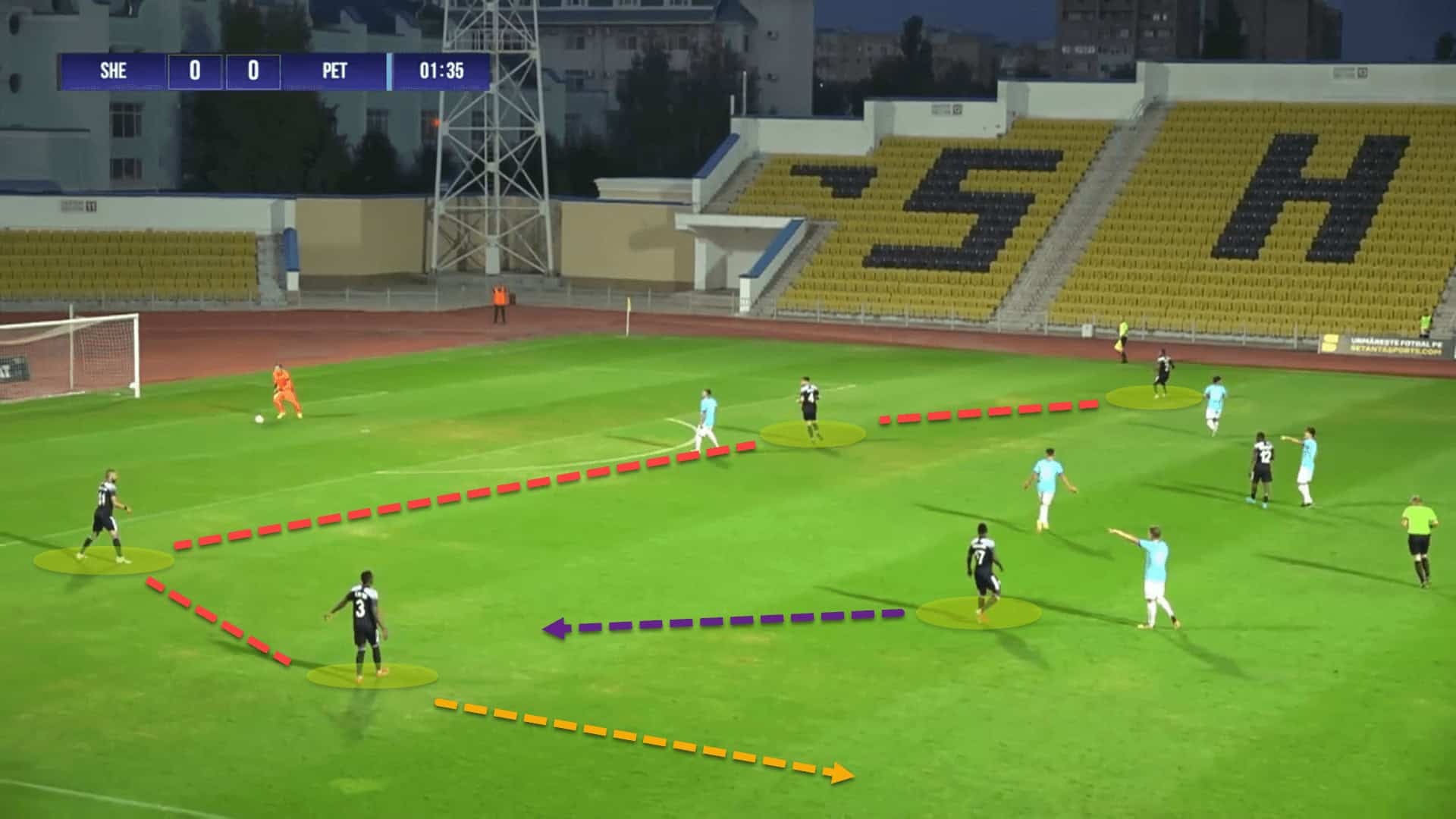 What’s also noticeable though is that there is quite a lot of ball circulation occurring among the backline and with the goalkeeper and single pivot. This is because, initially, Sheriff look to move the ball around slowly, hoping that the opposition step out to press which could open gaps inside the defensive block to play centrally.