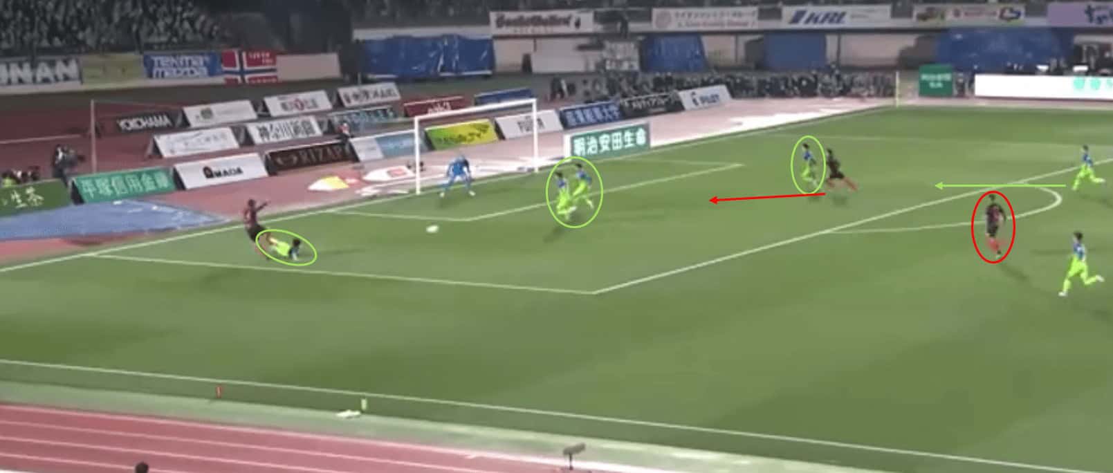 The counterattack ends with Koroki effortlessly pulling the Red Devils level in the tie as the Shonan Bellmare defence failed to react quickly enough to a counterattack. As can be seen on the edge of the box, there was still an unmarked Urawa Reds player should the ball have been cleared also.