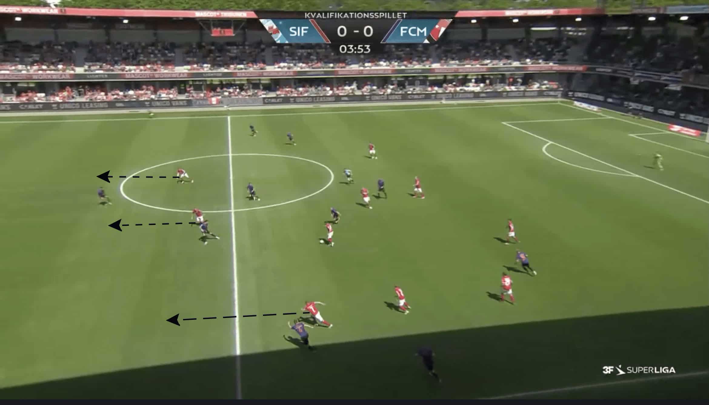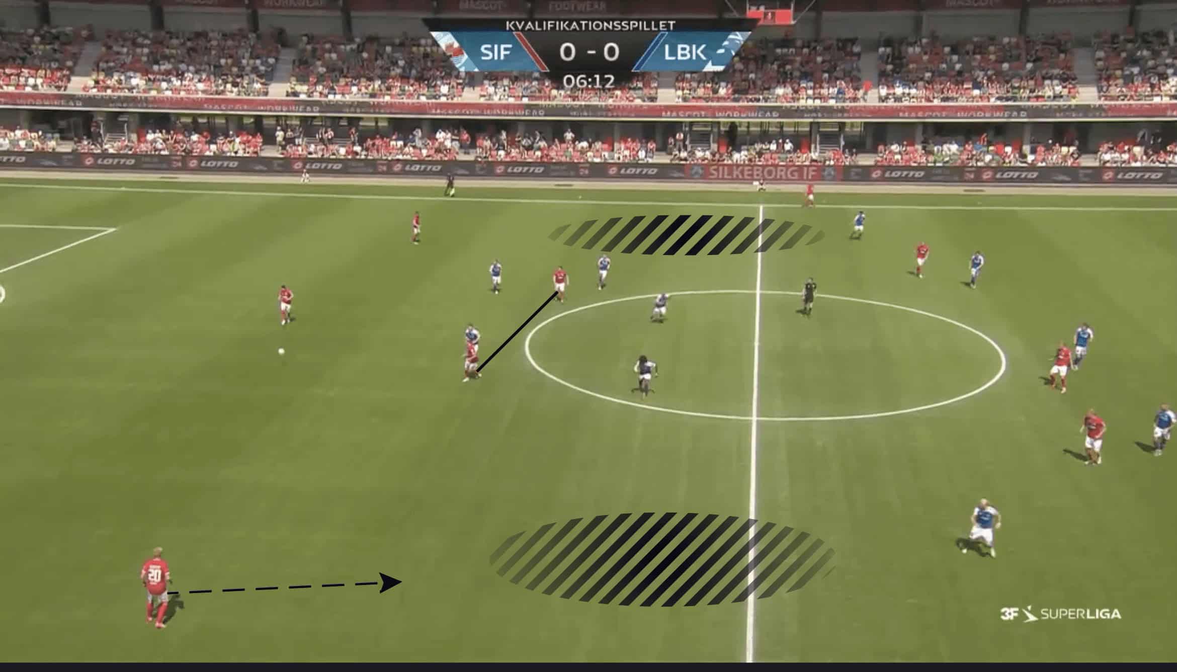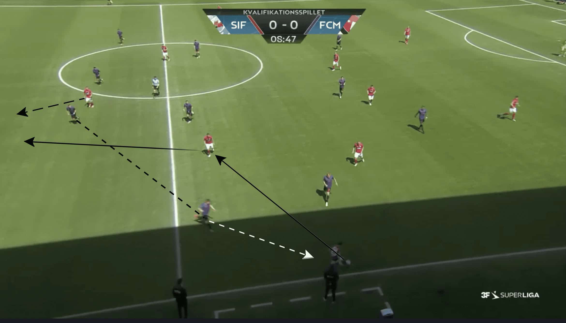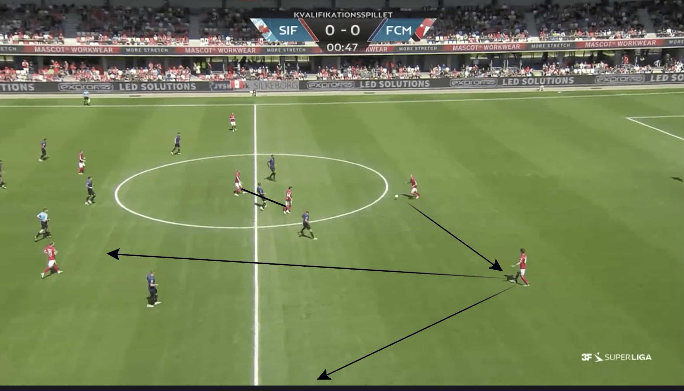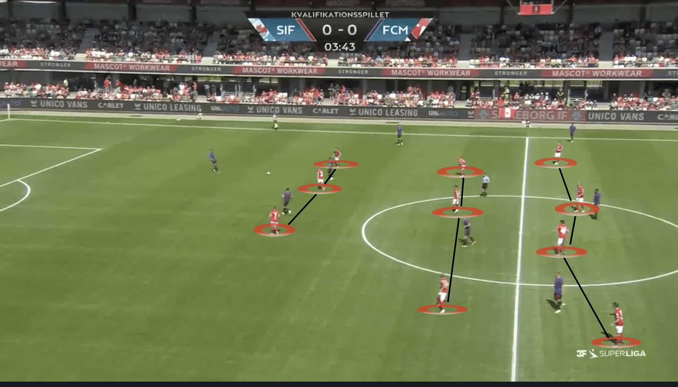 Using a back three, Silkeborg become less reliant on playing through the centre from deeper areas and can use their centre-backs to advance the ball. This allows them to take advantage of the opposition’s positioning and allows them to access the attacking midfielders in the centre through a different angle.