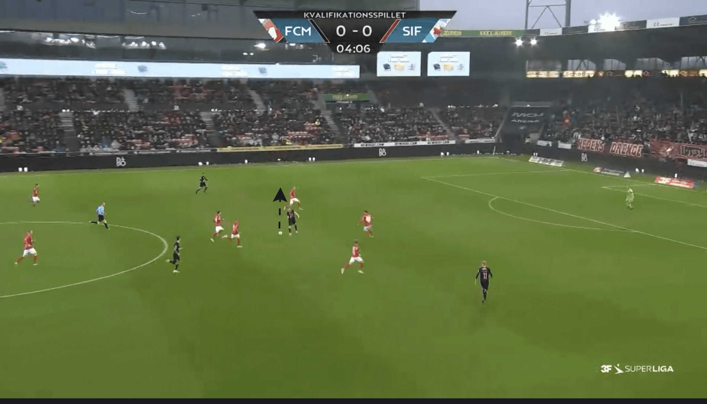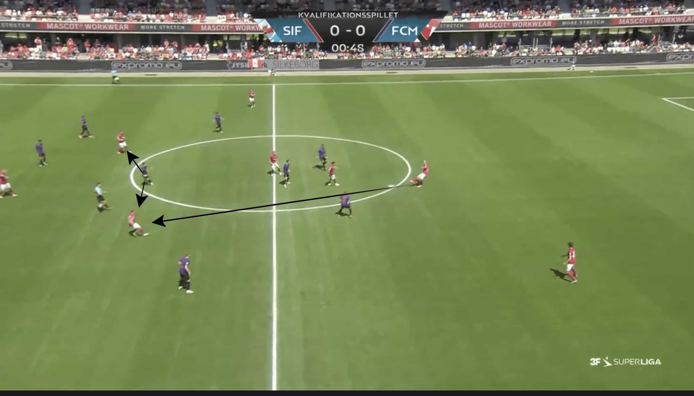 Silkeborg’s modified structure as well as their use of vertical passing through the centre is similar to that of Roberto De Zerbi’s Brighton. However, it would be unfair to state that the side completely executes actions in the same manner as the Premier League side. The example below looks to show how the side’s structure, as well as their principles, create opportunities to progress the ball and destabilise the opposition.
