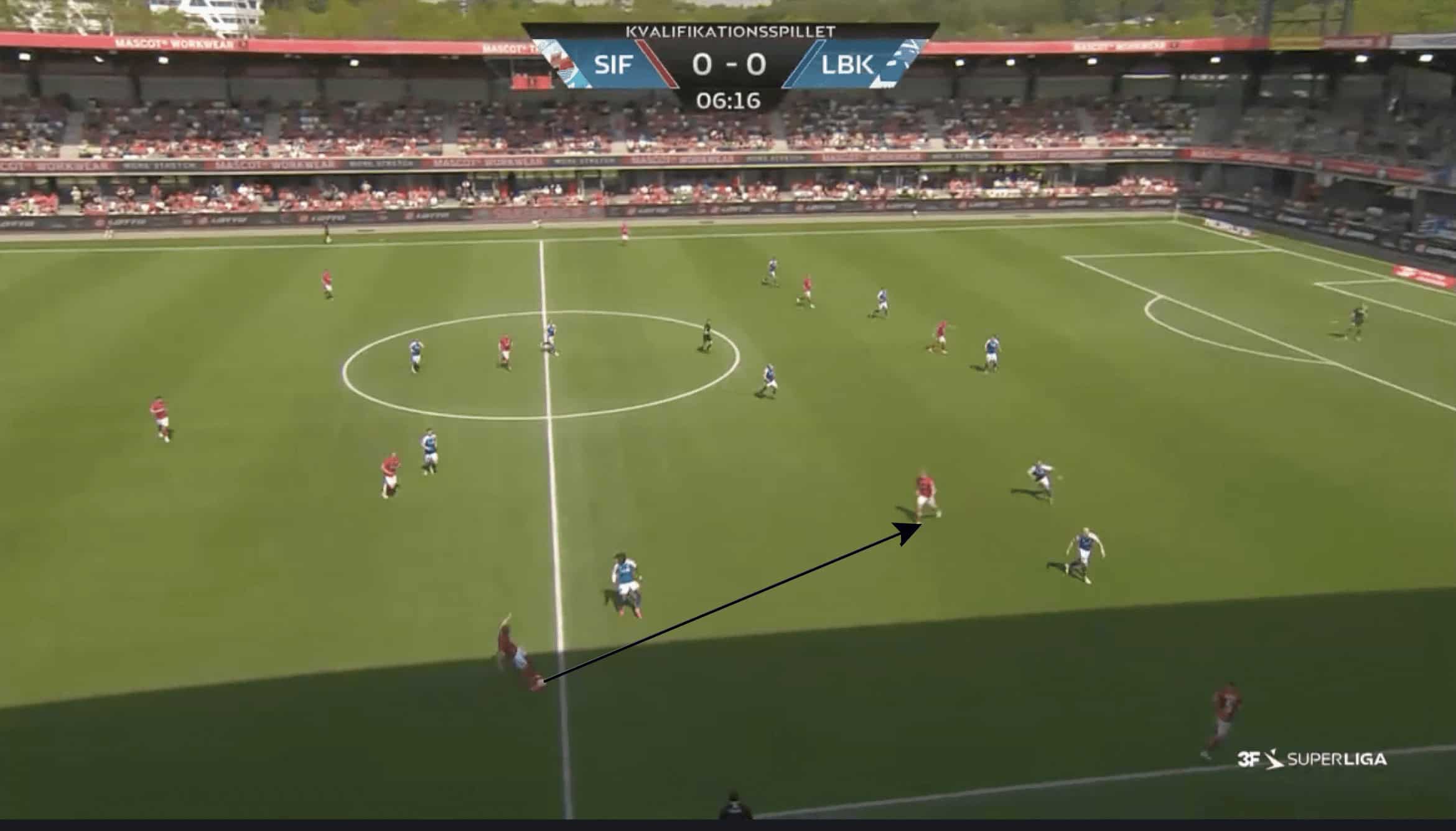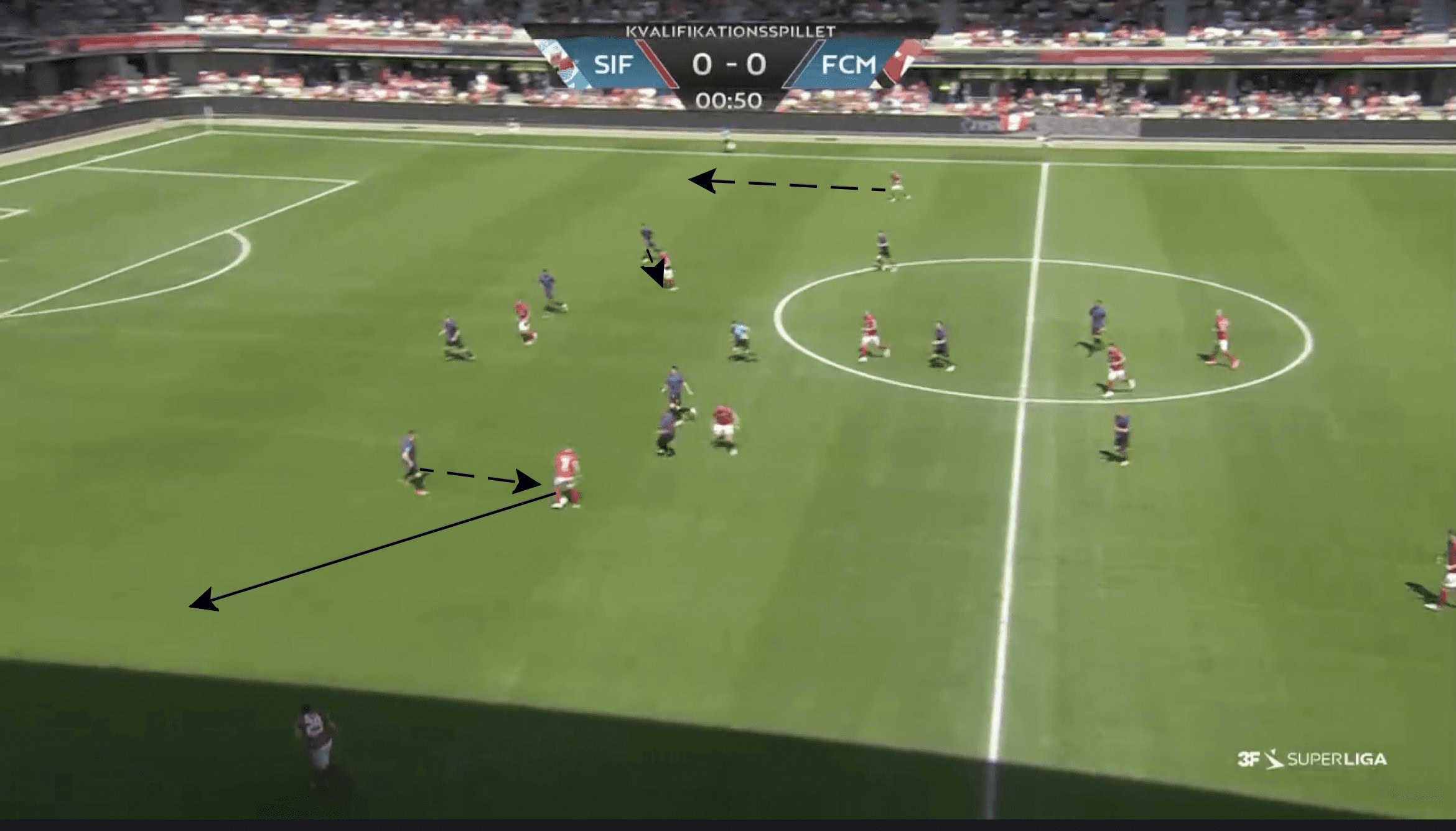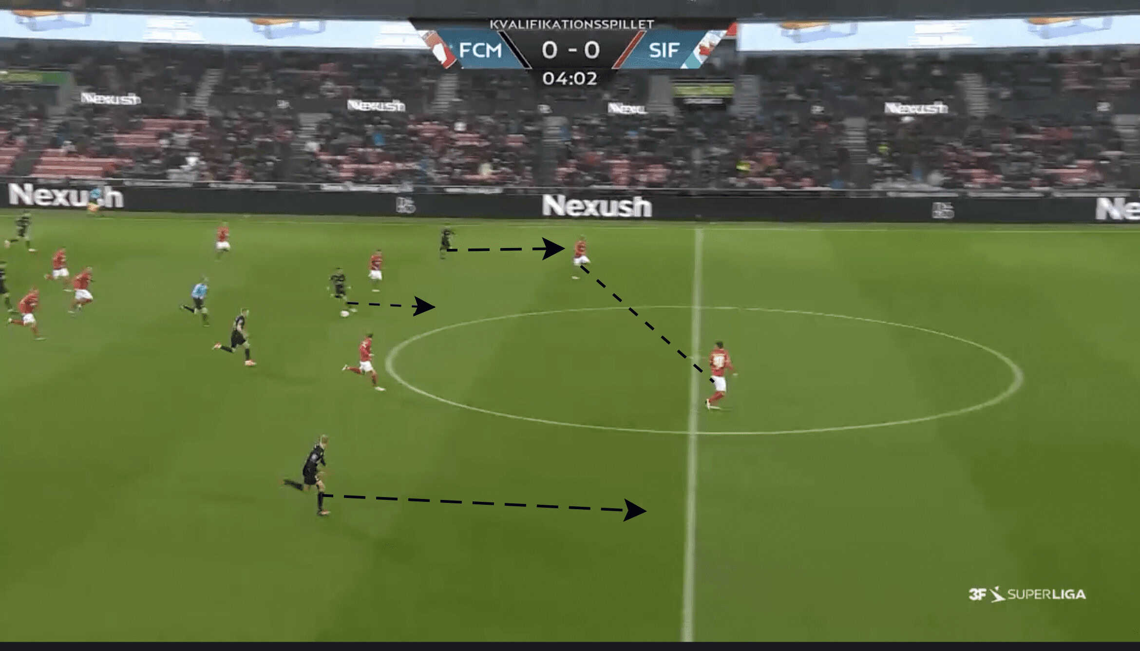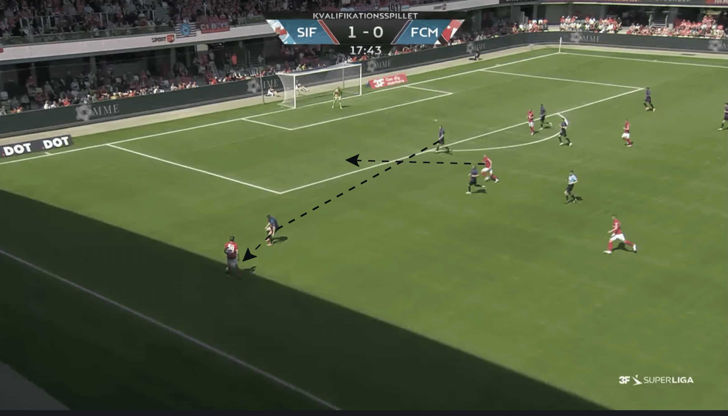 In circumstances where the opposition full-back does look to press one of the Silkeborg full-backs, cover is reduced in the backline of the opposition. This can be seen in the example below with a pass played to Lukas Engel, the left-back. Engel then looks to play the ball to Kaper Kusk in the centre who then plays a through ball to the striker.