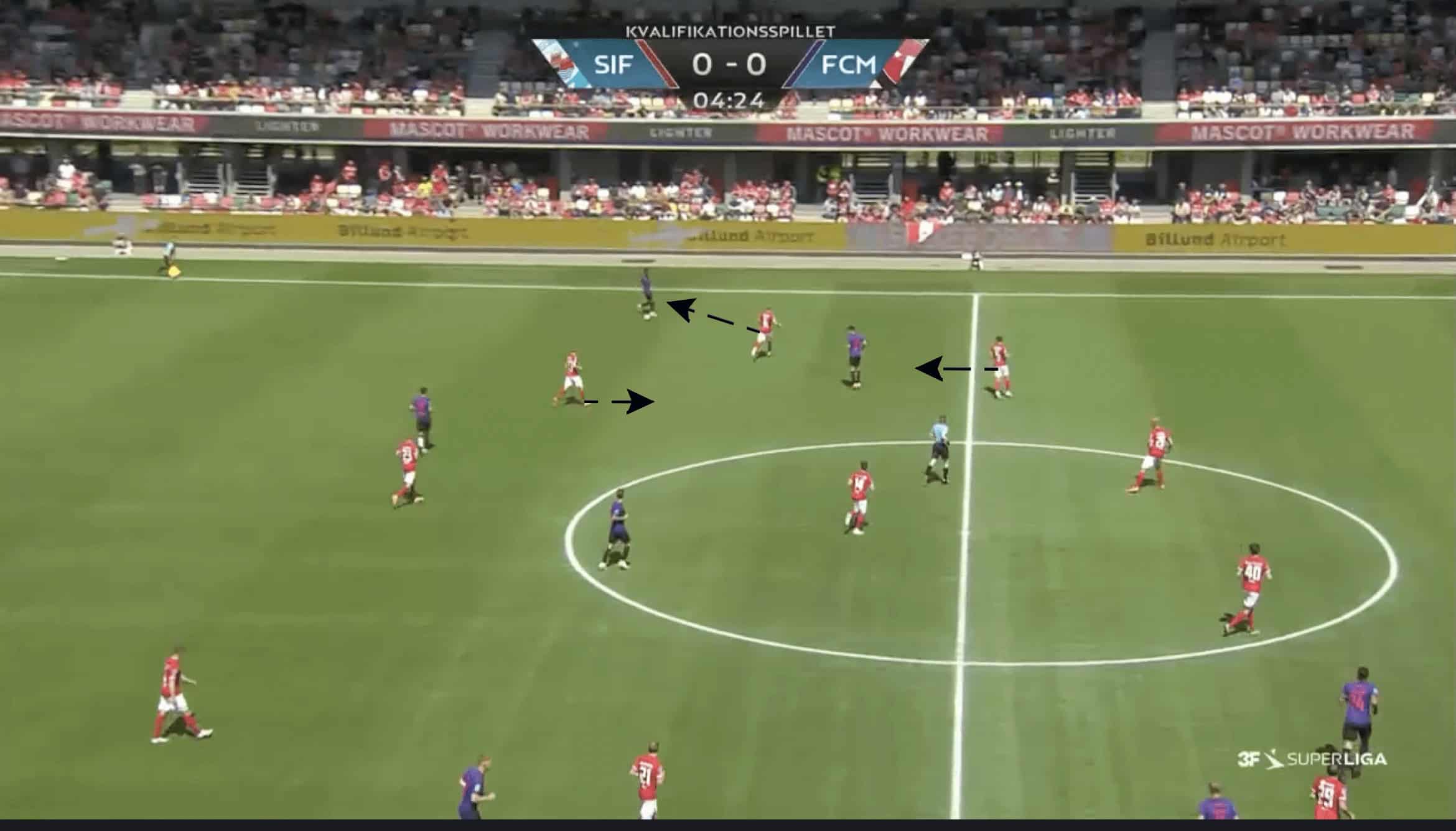 The first issue faced by the opposition is the Silkeborg double pivot of Pelle Mattson and Mark Brink. Due to their close proximity, they are both in positions to support the centre-back on the ball as well as provide support to one another after a vertical pass is played to either of them. As in the example below, if the opposition looks to orient their position to the double-pivot too closely, they leave space for one of the other centre-backs to receive the ball in wider areas and progress the ball further up the pitch, withering play towards the centre or wide area.