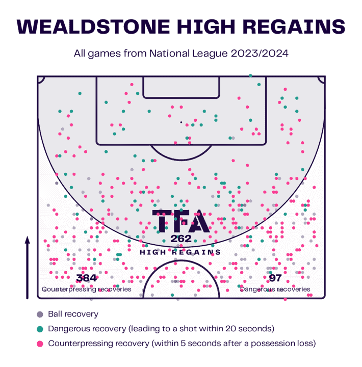 As you can see from the stats in the visual, Wealdstone have been very active in their approach out of possession, with a pleasing frequency of dangerous recoveries in particular.