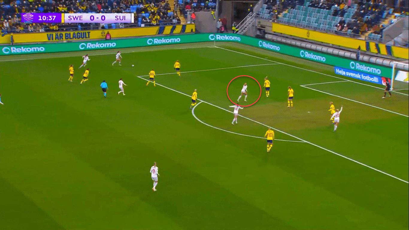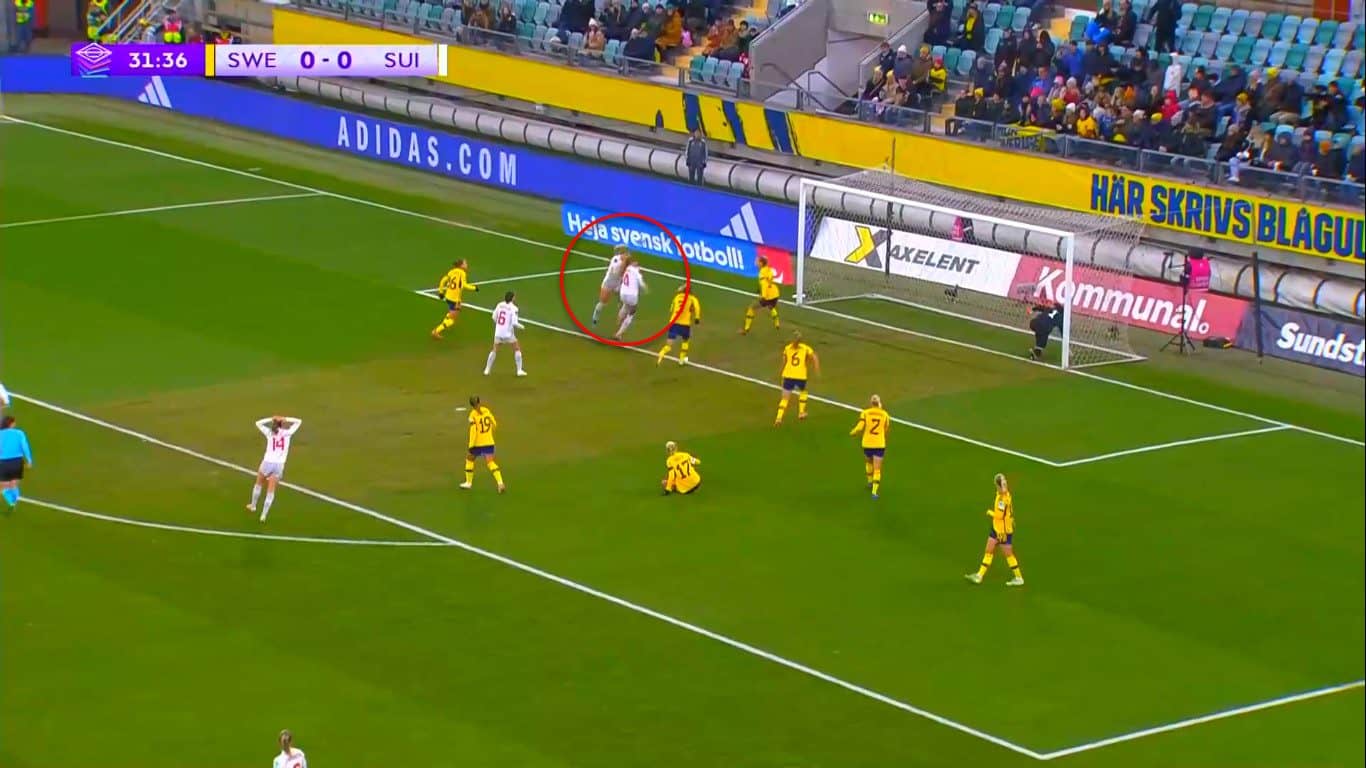 The following example shows a very dangerous chance that could have enabled Switzerland to get a draw against Sweden if not for the alarming miss of Pilgrim and Alisha Lehmann. When the ball was coming from the crossbar, both Lehmann and Pilgrim did not really see each other, and both wanted to get to the ball first, which led to Lehmann heading it accurately, missing one of Switzerland’s biggest chances of the match.