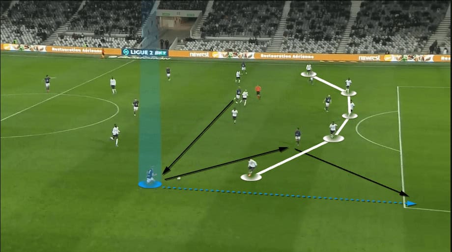 As the above image shows, by creating one-on-ones across the backline, the forwards now control where the space is. The left-winger moving towards the ball to receive it brings the right centre-back with him. The left-forward then passes to his centre-forward who is playing in front of the central centre-back. The centre-back jumps to the ball creating a huge gap in Nîmes’s backline.