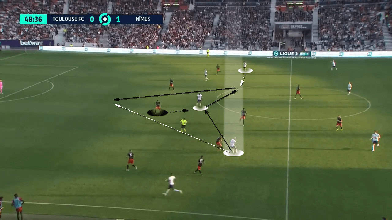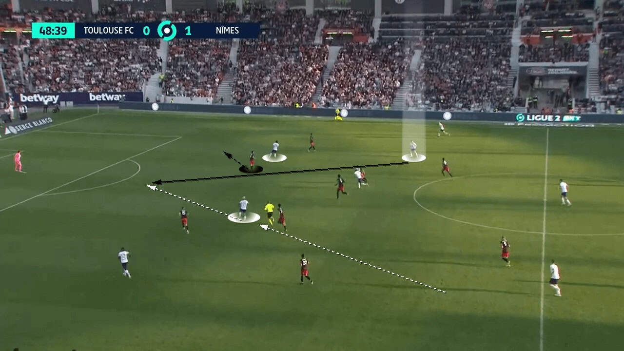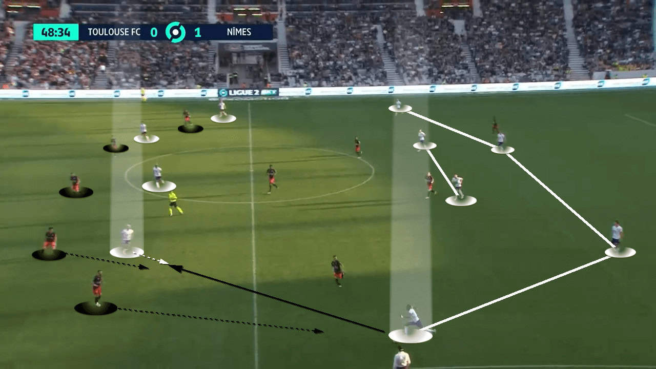 The above scenario shows the moments after Toulouse have regained possession against Nîmes. Instead of pulling out wide, the inverted winger plays up against the side centre back. This pins the defender preventing him from pressing the area ahead of him.