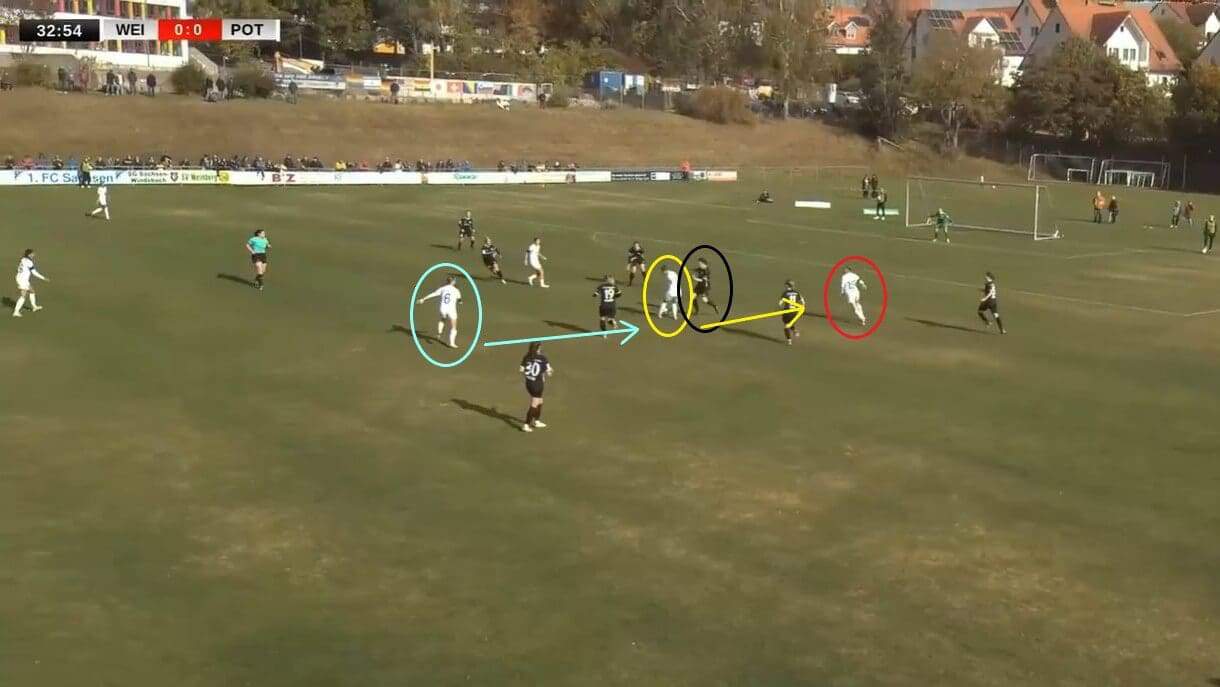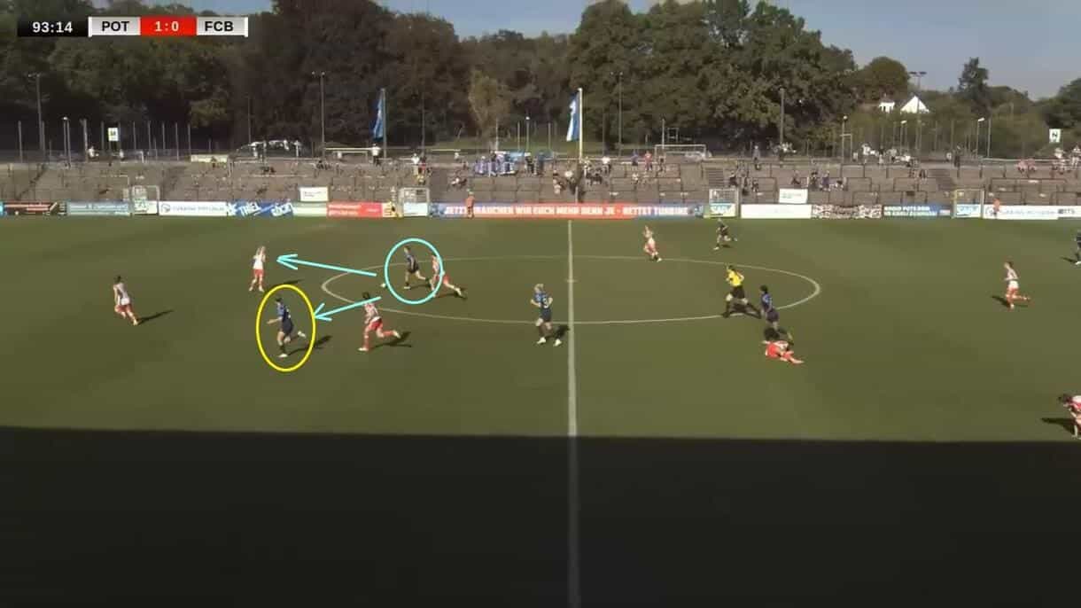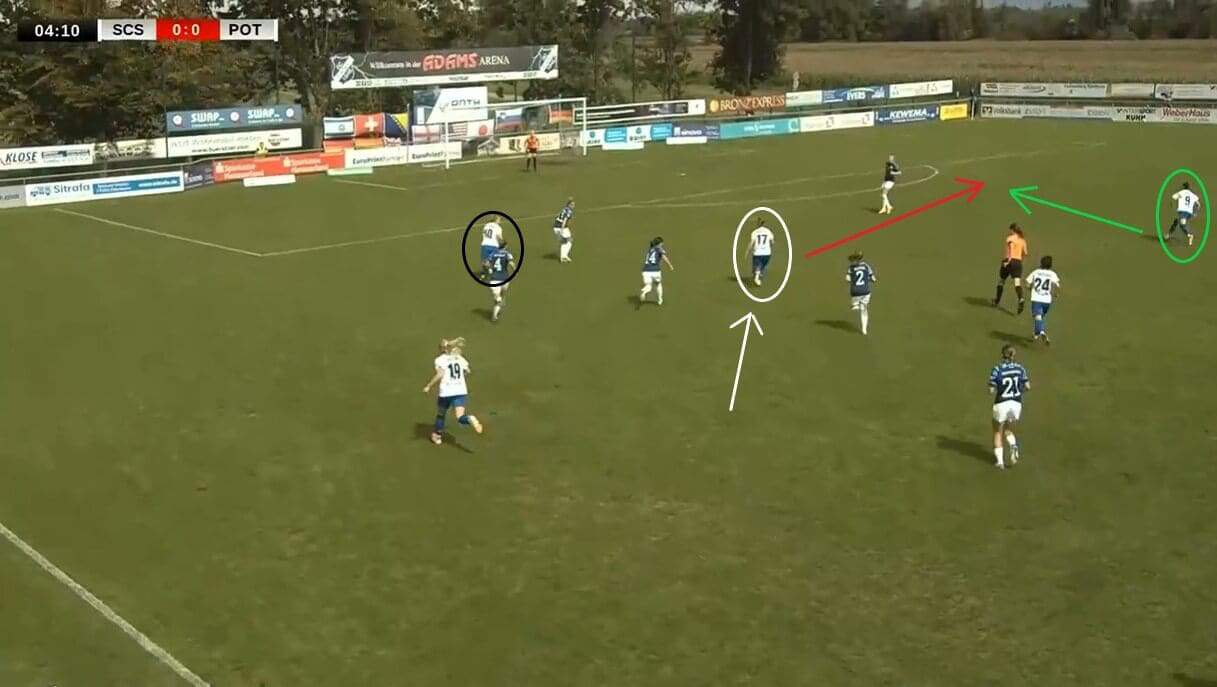 They were aided in this situation by Weinberg taking the bait and moving towards the ball at the wrong moment, with Julia Brückner moving out of line and making it easier for Grincenco to run into the gap behind her. However, the fact that Potsdam managed to execute this transition with the same quality as they demonstrated when in open space does show how they have been adaptable and can play with the same mentality and tactics regardless of how their opponents set up against them, which is a huge positive for them as they look to maintain their promotion bid.
