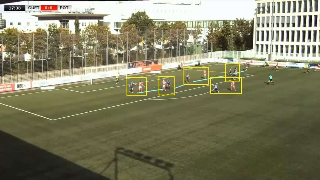 Altering to a back five shape has also allowed them to implement a player-to-player marking mentality, with each player picking up an opponent here and staying tight to them so as not to enable Gütersloh 2009 any opportunity to shoot at goal. The result is that the cross from midfielder Finja Kappmeier on the far side of the field fails to find a teammate, and this is not the only time that Potsdam have succeeded in ending threats early with their new system in place, with them winning 70% of their defensive duels so far and 44% of their aerial battles.