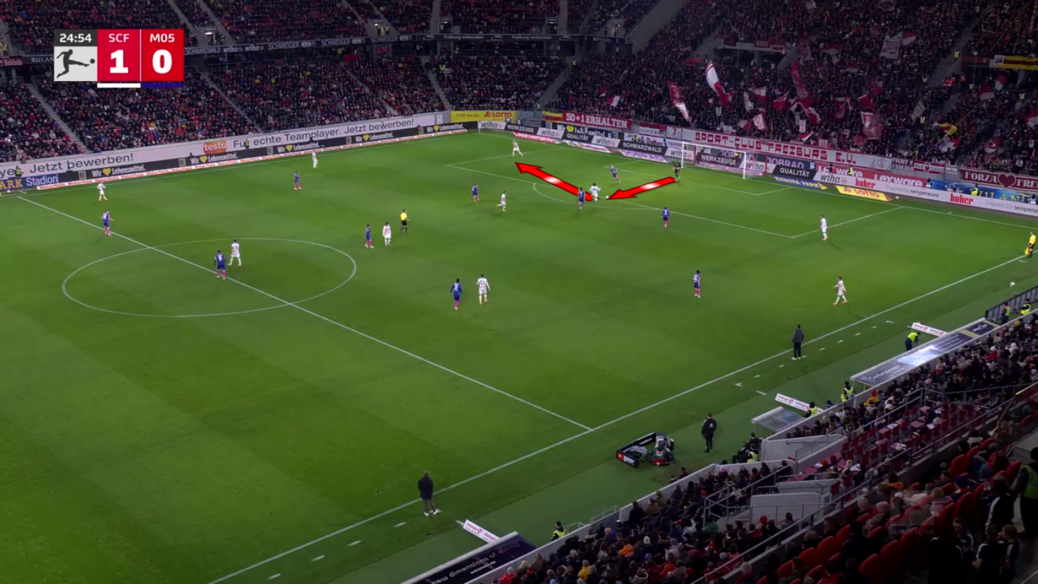 Mainz tried to cut off that side of the field, but Freiburg was easily able to find the open man through the triangle.