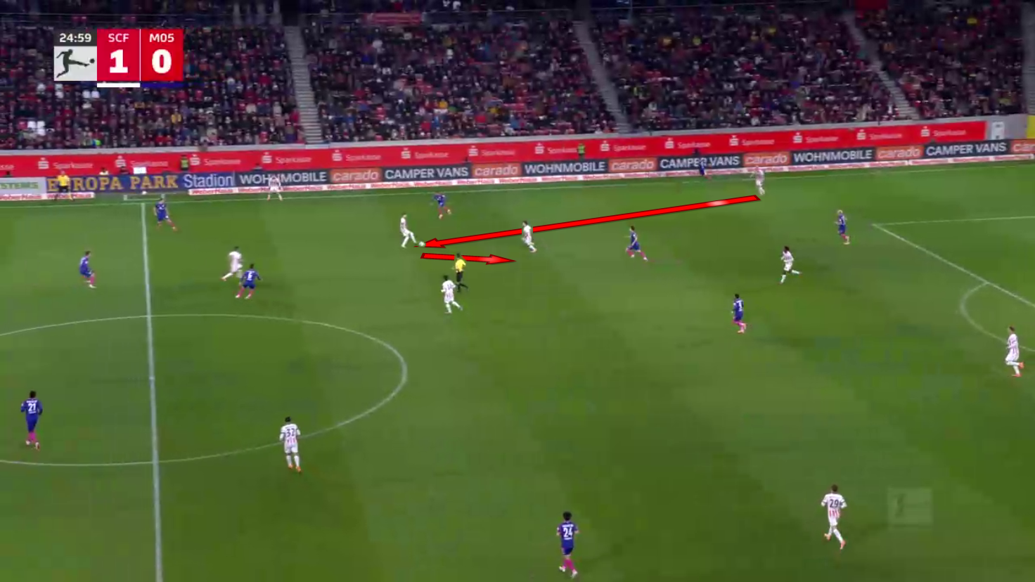 This completely broke down their attacking press, allowing Freiburg to play a vertical pass and a lay-off to find space behind the first line of press.