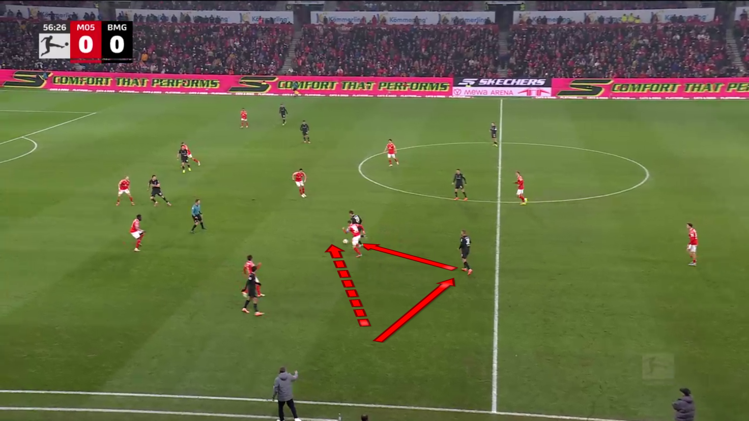 In this situation, Gladbach played a backwards pass, and Mainz tried to push forward into their attacking press out of their deep block.