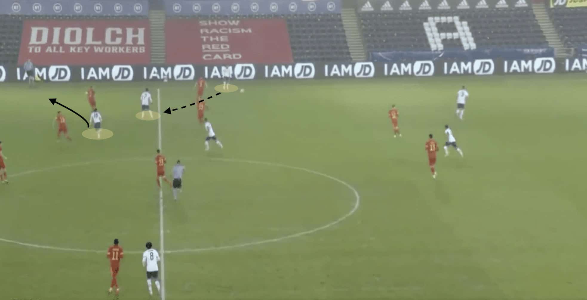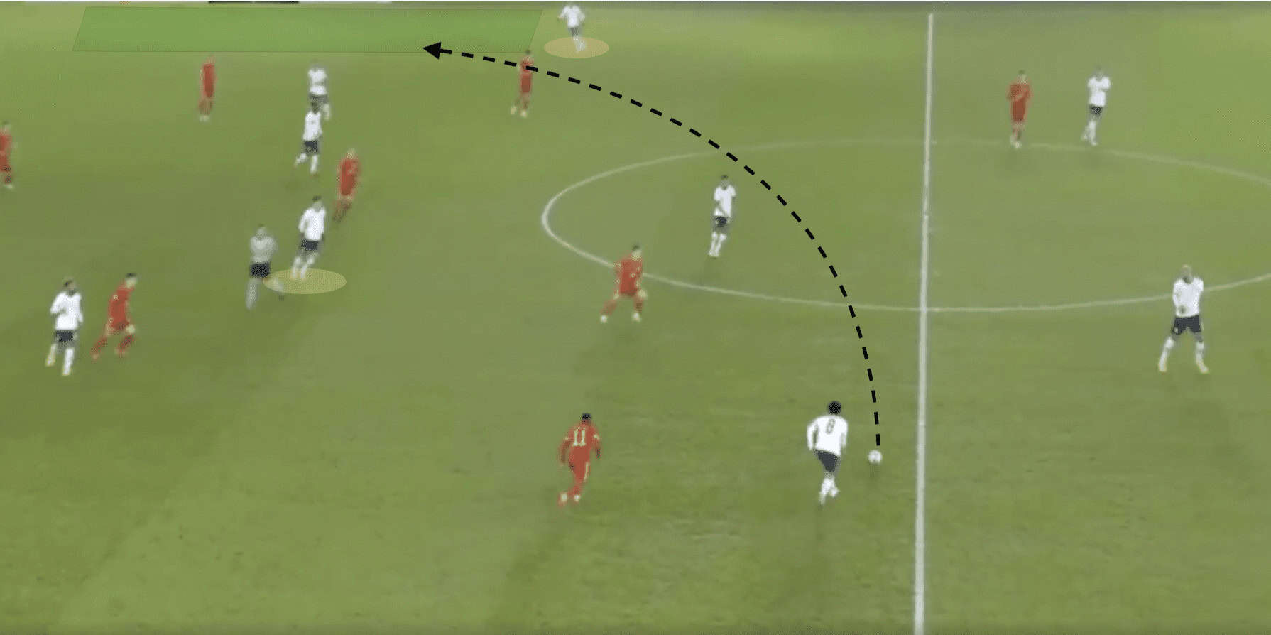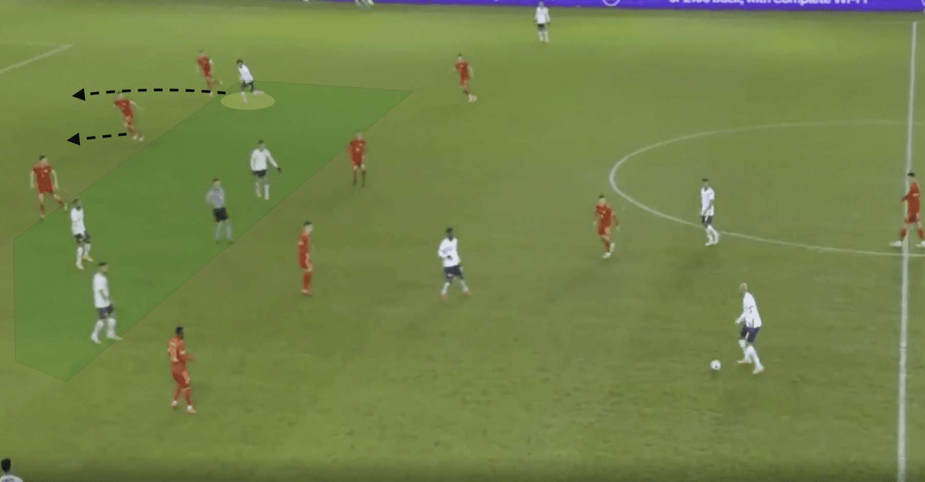 Finally, some attacking rotations take place in the middle of the pitch too. This tactical analysis has focused more on how the team takes space on the wings, but they create space in the middle too. Because the center can get congested with the front three taking up the inverted triangle, rotations need to occur. An example materializes when Brooks is in possession. The triangle is present, and the pitch is fairly congested. McKennie understands this and makes a forward run. Although this is not a high percentage pass that would lead to a goal, that is not its’ purpose. The Juventus midfielder makes this run to test the centre-backs and create more space in the midfielder for the front three to work. As you can see, the Welsh centre-backs’ inertia is moving towards the goal, indicating that one of them is prepared to follow McKennie’s run. This opens up the space highlighted below.