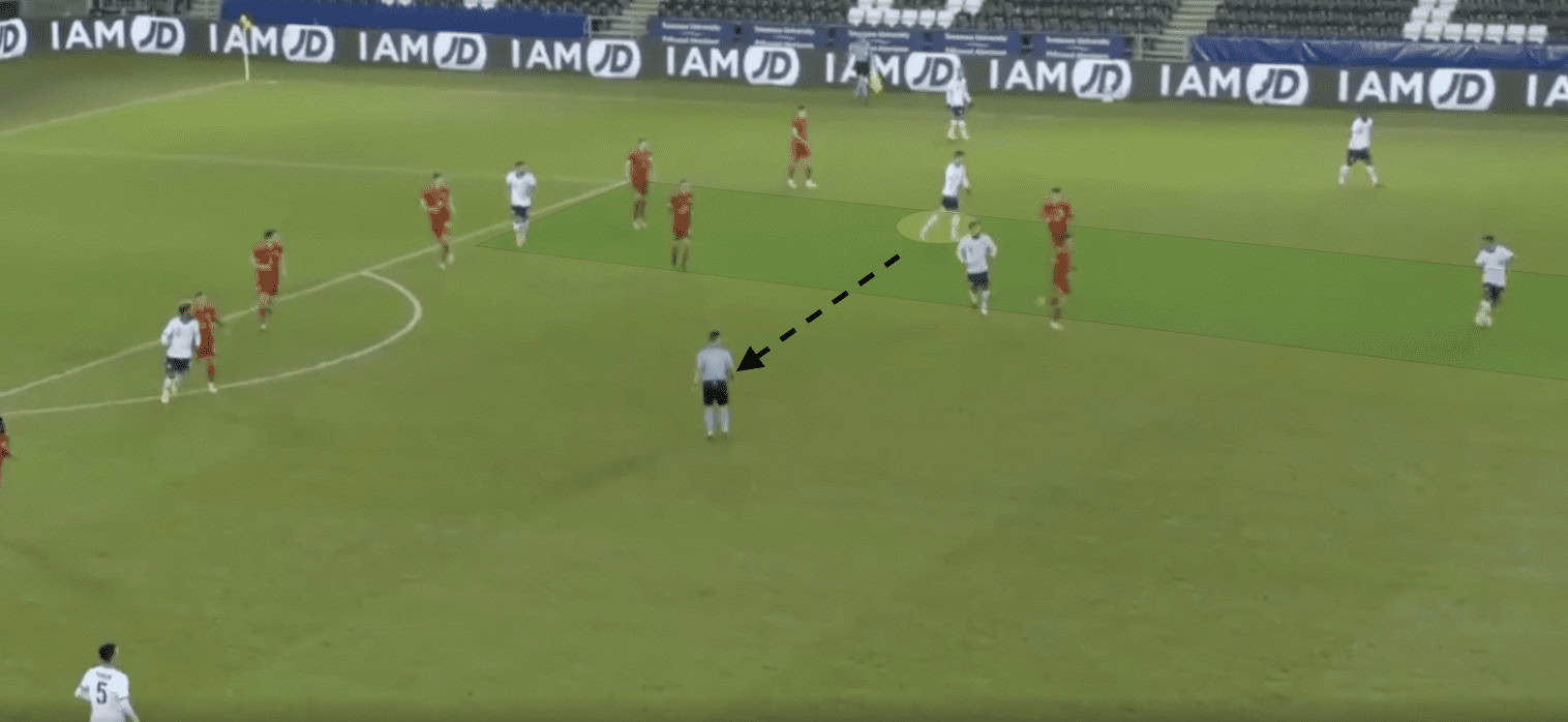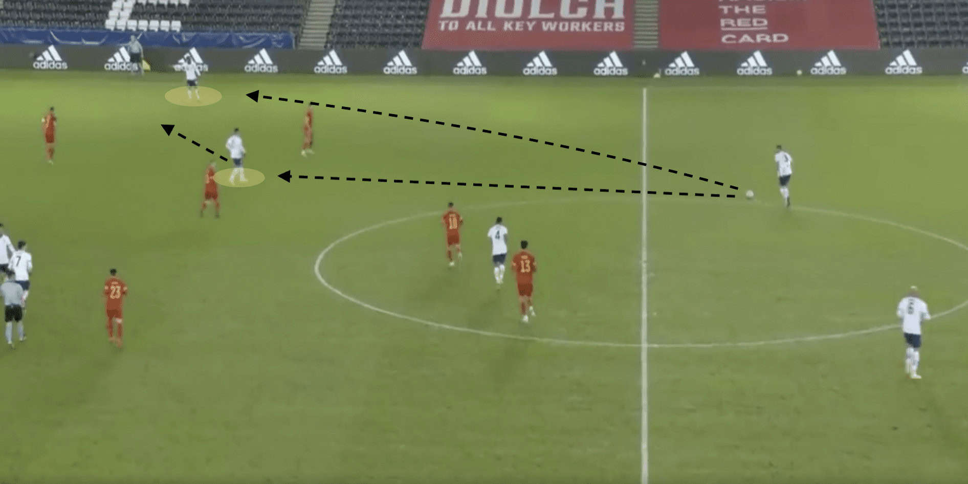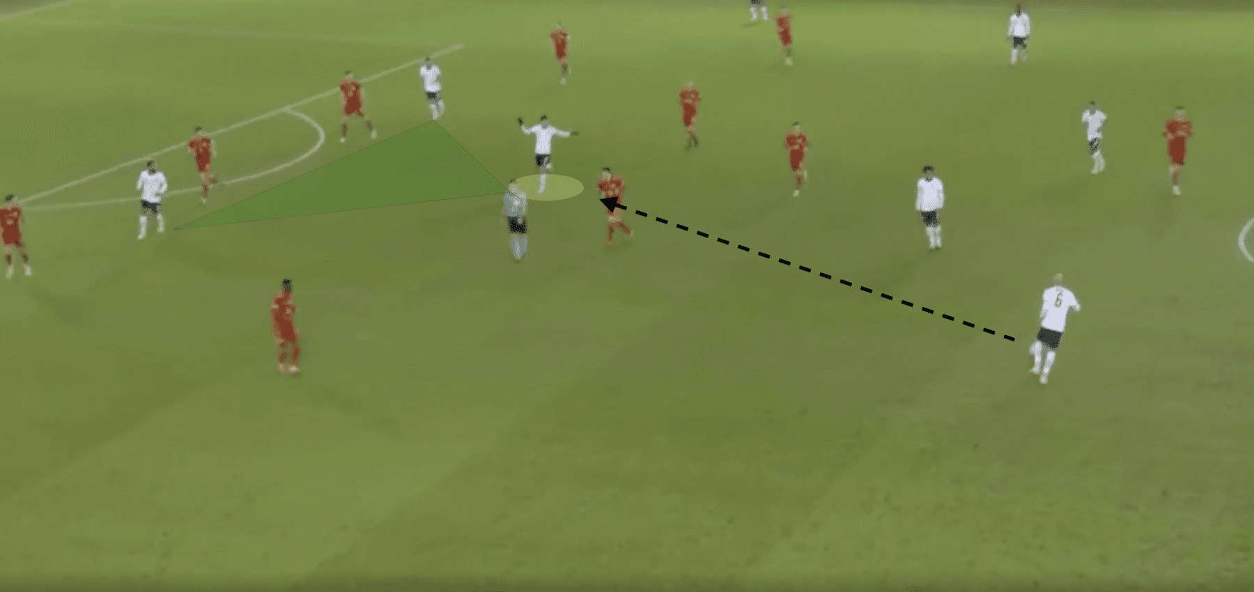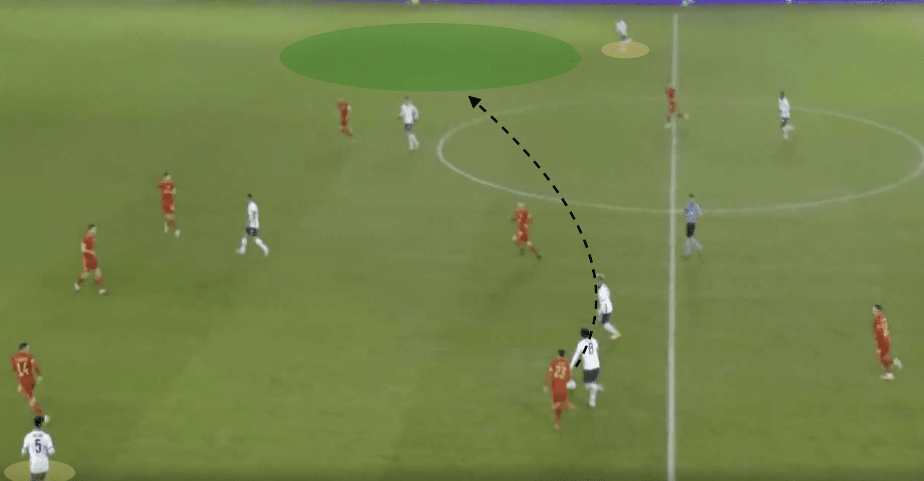 Finally, some attacking rotations take place in the middle of the pitch too. This tactical analysis has focused more on how the team takes space on the wings, but they create space in the middle too. Because the center can get congested with the front three taking up the inverted triangle, rotations need to occur. An example materializes when Brooks is in possession. The triangle is present, and the pitch is fairly congested. McKennie understands this and makes a forward run. Although this is not a high percentage pass that would lead to a goal, that is not its’ purpose. The Juventus midfielder makes this run to test the centre-backs and create more space in the midfielder for the front three to work. As you can see, the Welsh centre-backs’ inertia is moving towards the goal, indicating that one of them is prepared to follow McKennie’s run. This opens up the space highlighted below.