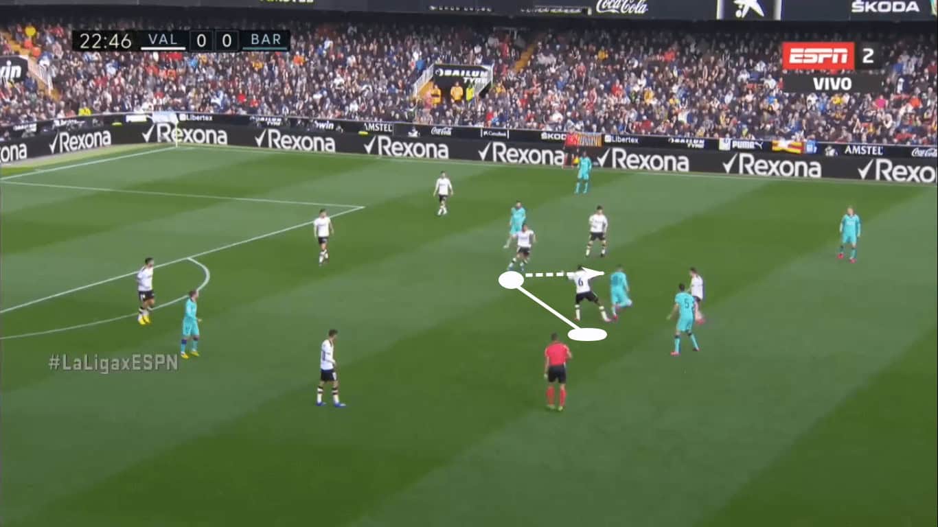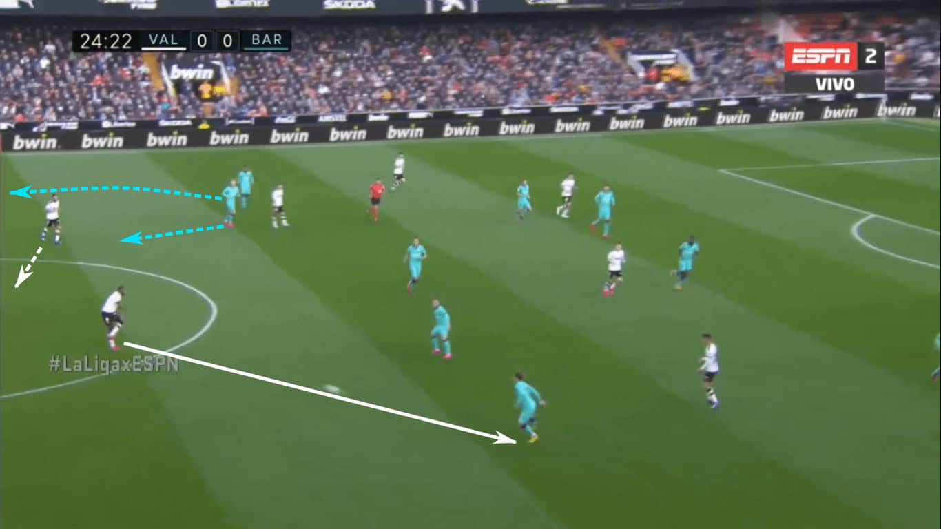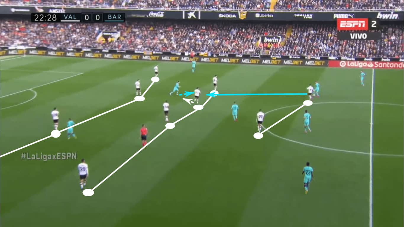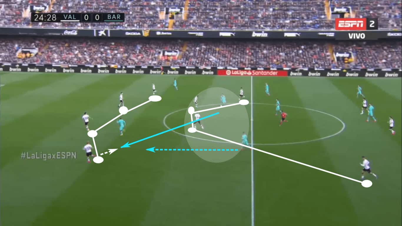 Unlike the Sociedad sequence, the two holding midfielder closed the gap between the lines and delayed the counterattack. The resulting pass went straight to Wass, allowing Valencia to relaunch the attack. A poor passing angle, slow pace to the attack and sound defensive recovery led to the turnover. The xG battle was 1.50 to 1.49 in Barcelona’s favour, but that xGA still beat the season average of 1.64, Given that the opponent was the league leader in xG, that’s not a shabby number.