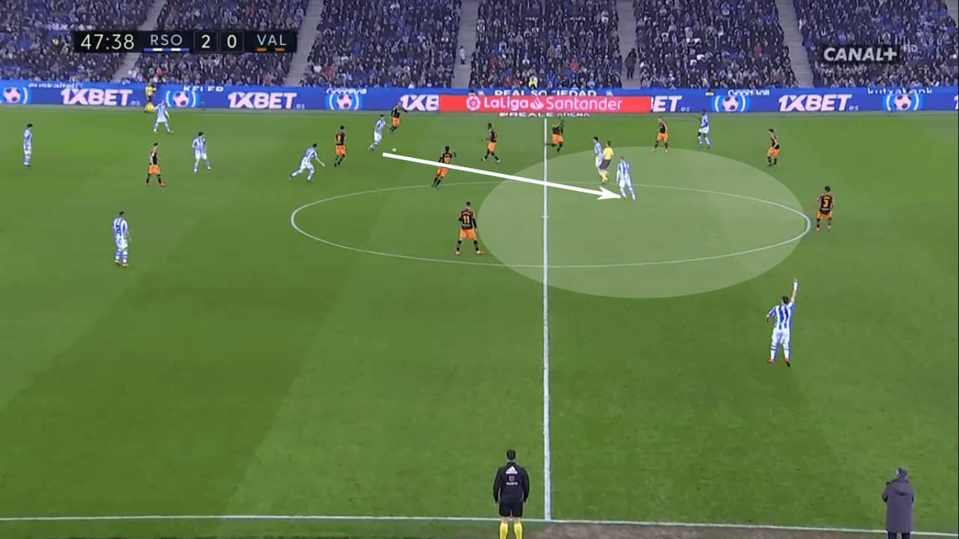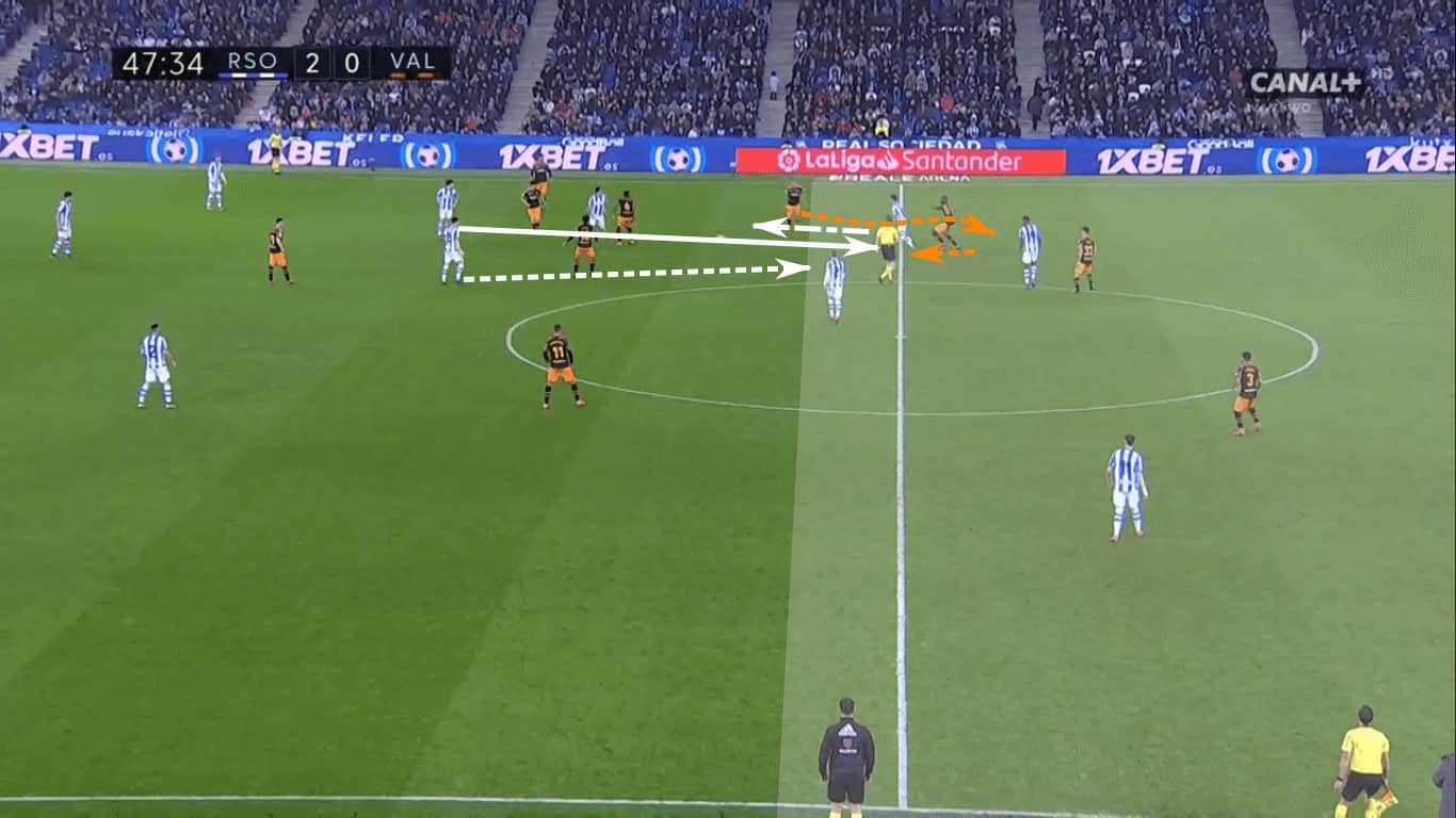 Sociedad played forward, but Mikel Oyarzabal was forced backwards. Notice the defensive interaction of Mouctar Diakhaby and Daniel Wass. Diakhaby funnels Oyarzabal into the path of Wass, but, instead of assisting with the tackle, the Dane makes a temporary positional switch with his centre-back. That odd decision allowed Oyarzabal to dribble unopposed into the midfield.
