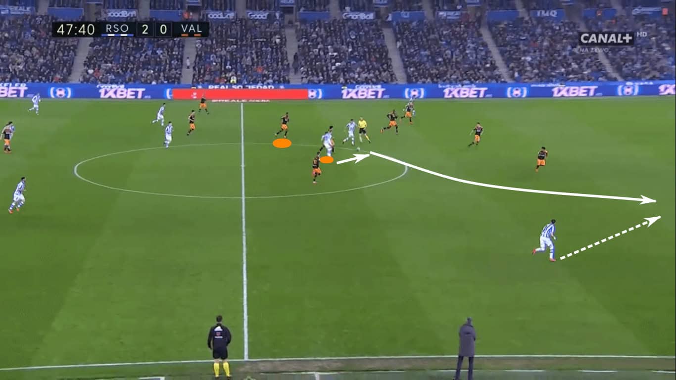 The midfield fails to recover and Sociedad’s combination springs Adnan Januzaj into the right-half space. Not only is he free to sprint forward, but the situation is also hurt by Sociedad’s ability to run directly at the Valencia backline. With Ødegaard receiving and laying the ball to his streaking teammate, it’s full-blown chaos at the back.