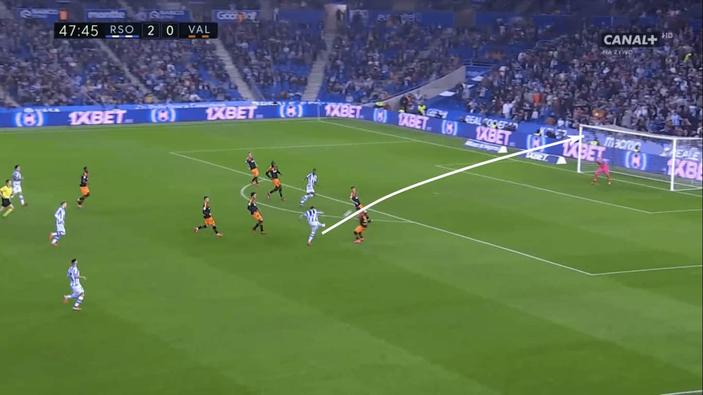 This shot from Januzaj is too beautiful to leave out. While you can argue Jaume should have done better given his positioning and the distance of the shot, it’s a perfectly hit ball. The bigger issue is the poor containment by Jaume Costa. No one in the Valencia side manages to complicate the angle to goal, not do they deal with the run of Alexander Isak, who could easily have been played through the central channel. The midfield’s inability to either recover the ball or commit a foul allowed Real Sociedad to run at the vulnerable backline. This was poor defending every step of the way, but the early errors in the midfield led to the progression of the play.