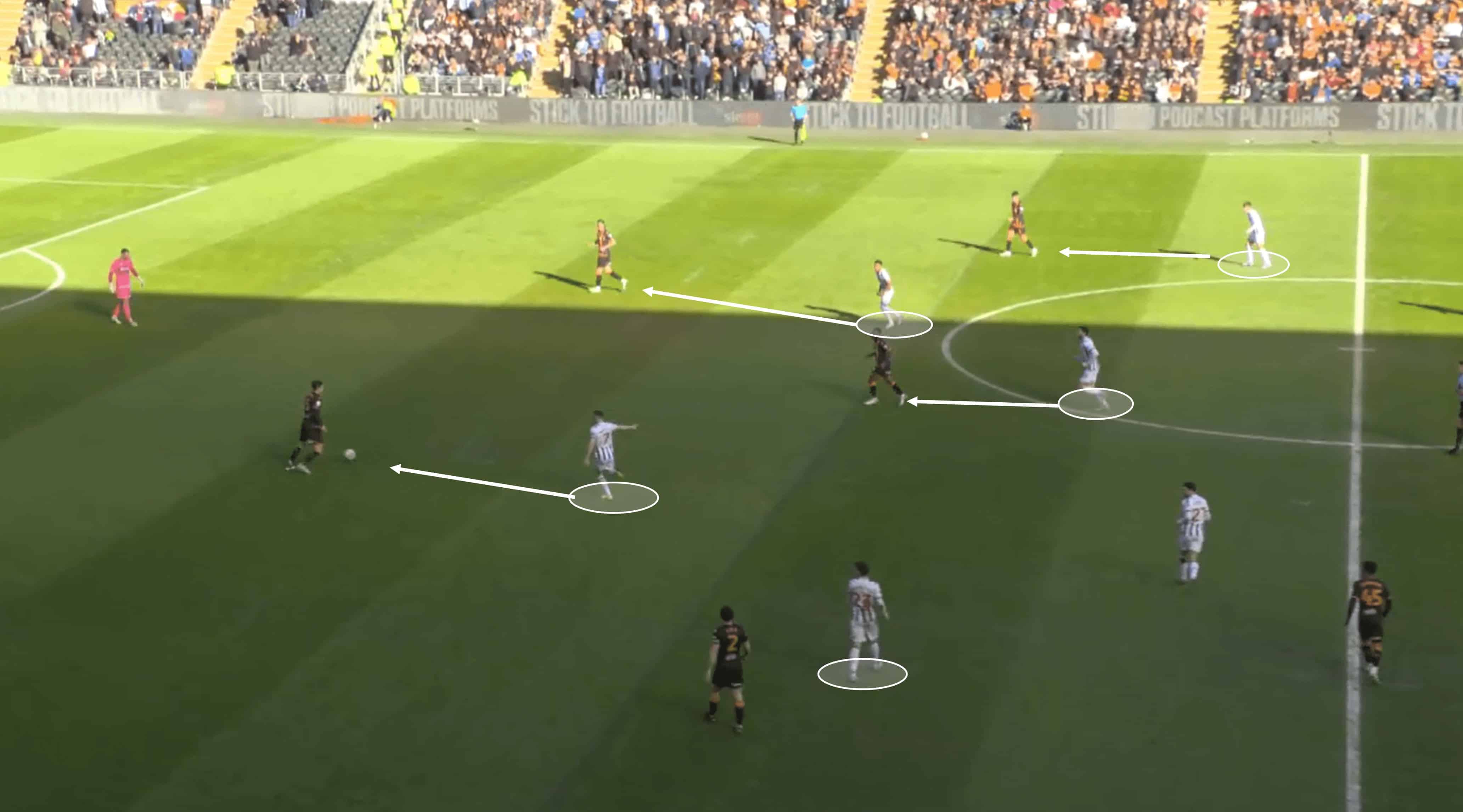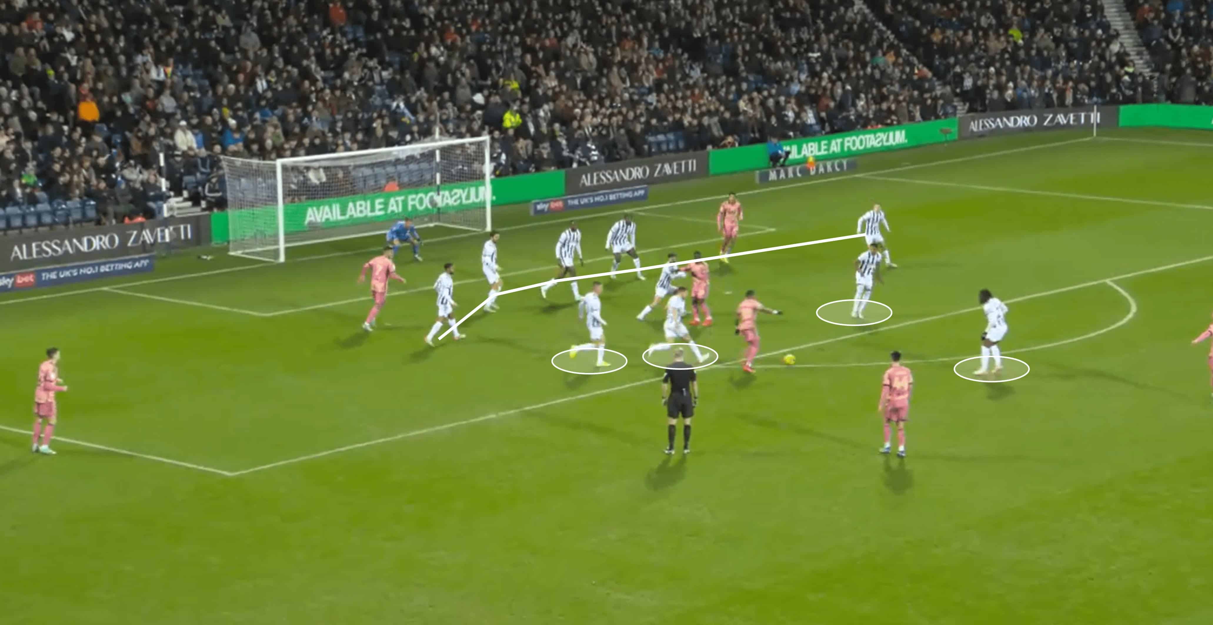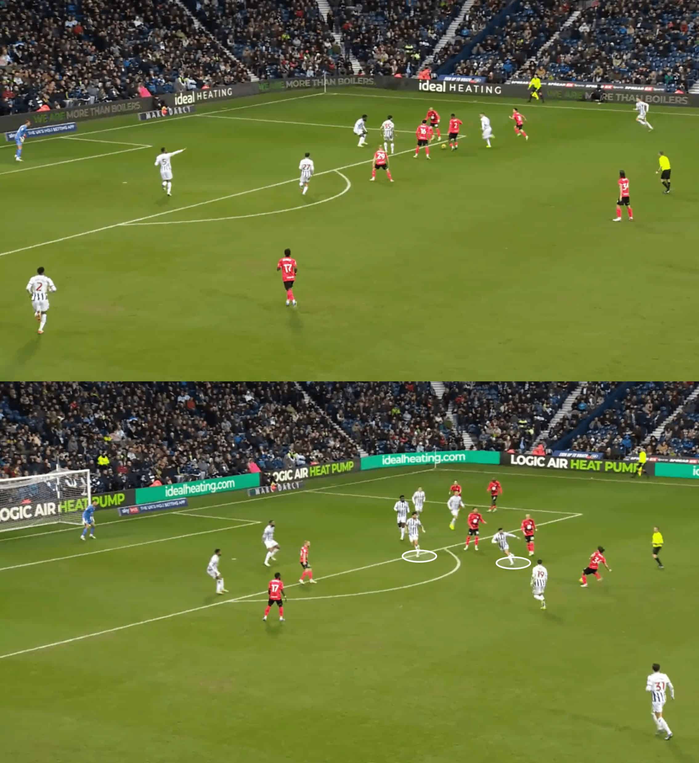 Counterpressing is not something you will see as often from the Baggies. Still, as you can see, they have a tendency to execute this skill in wide areas and attacking midfield zones – picking the right moment to try and swing a counterpressing move is key and something Corberán has instilled into his players very well.