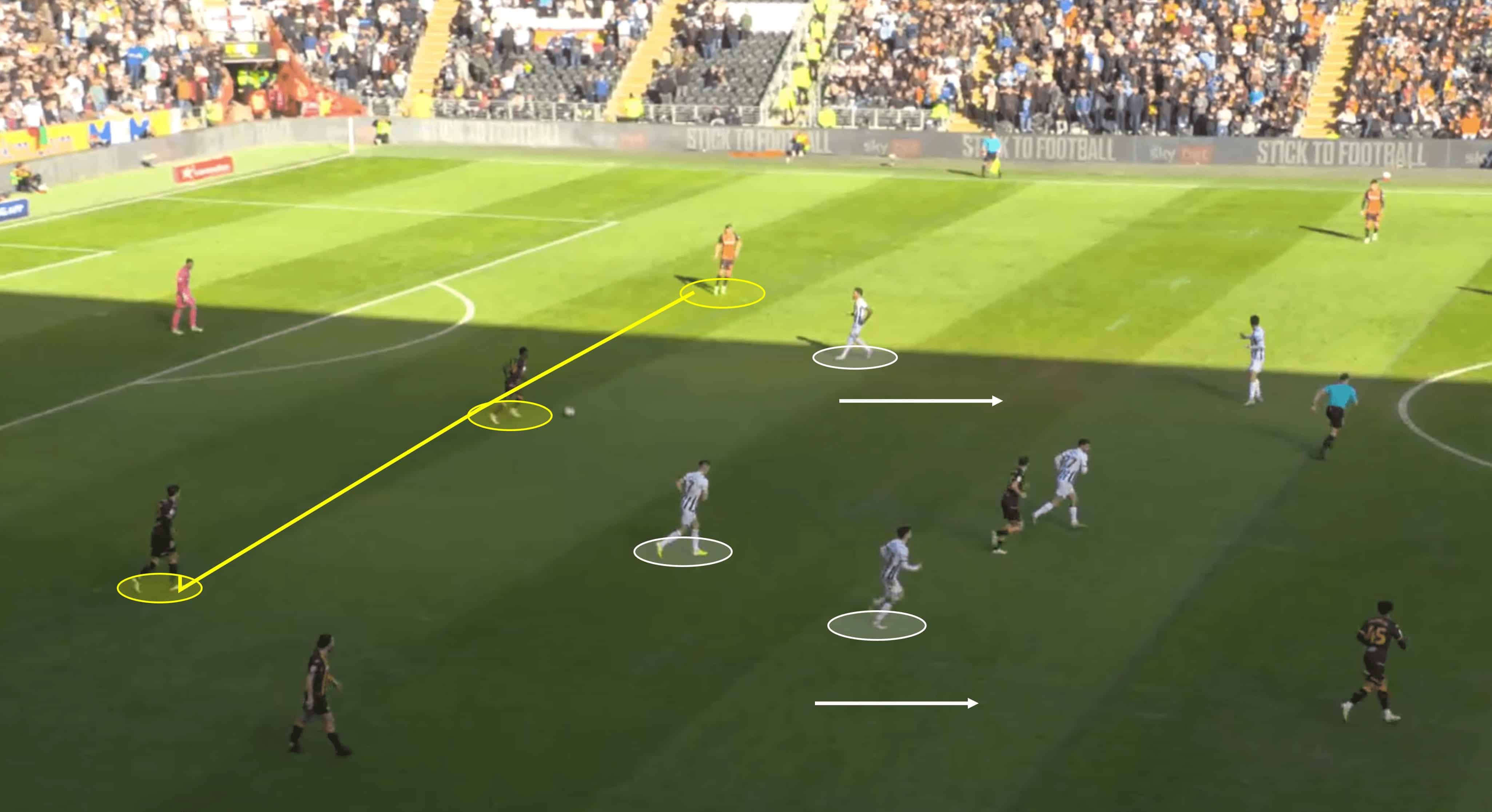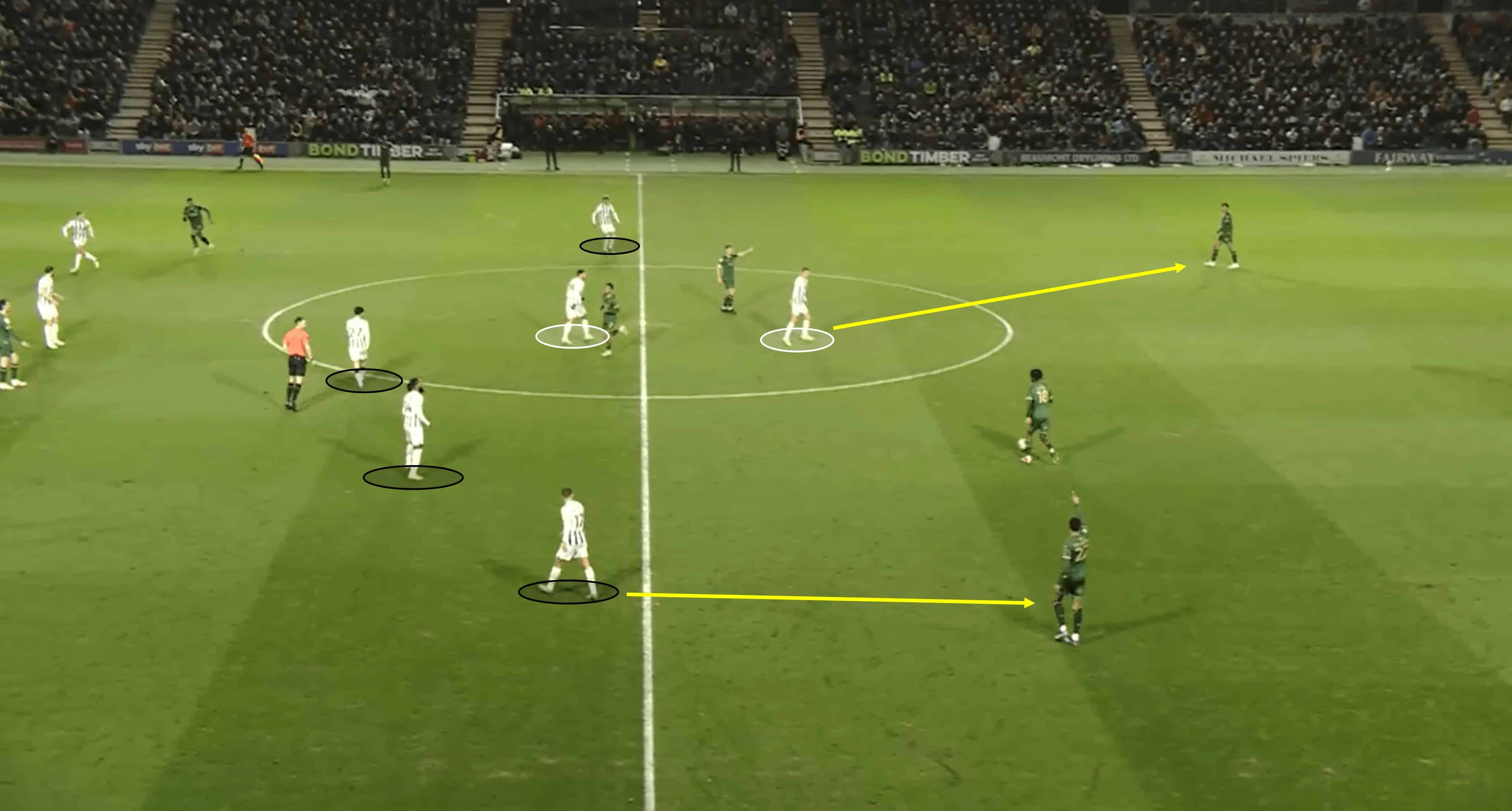 And that’s what we see in this image. With the opposition seemingly in no rush to get forward, and showing reluctance to play long, WBA sense the chance to hunt them down. The front two and midfield unit seem to act in unison in these moments – the CFs pressing the opposition CBs while the Baggies midfielders step up to squeeze the space but also man-mark any passing options. Again, this is aimed at forcing the opponent into going long, or into making a mistake.
