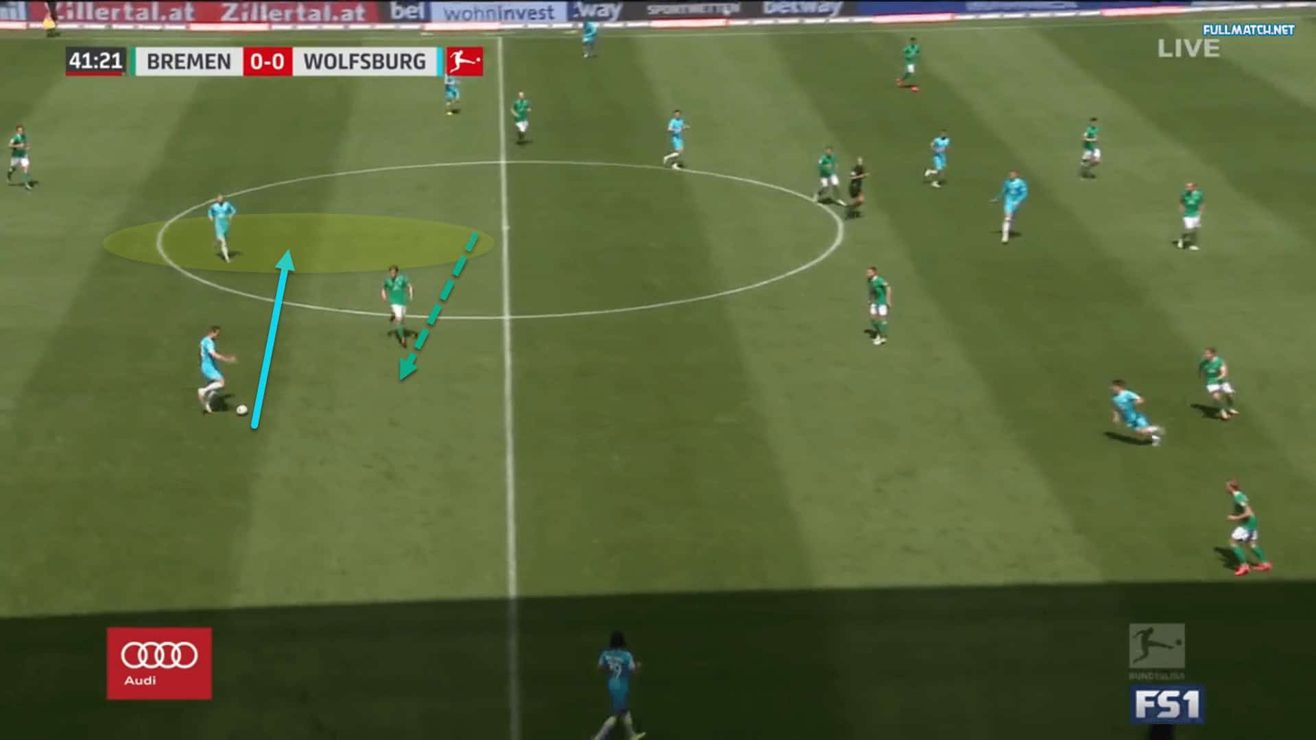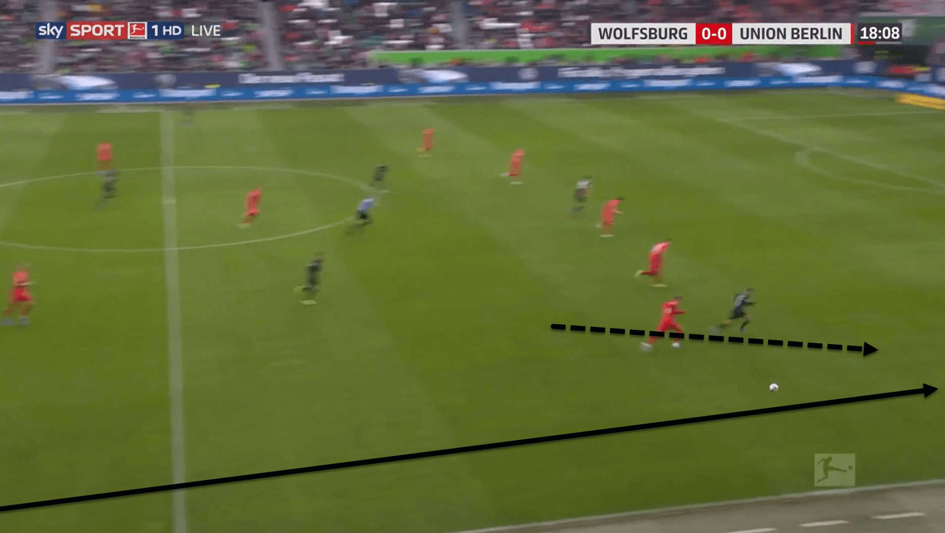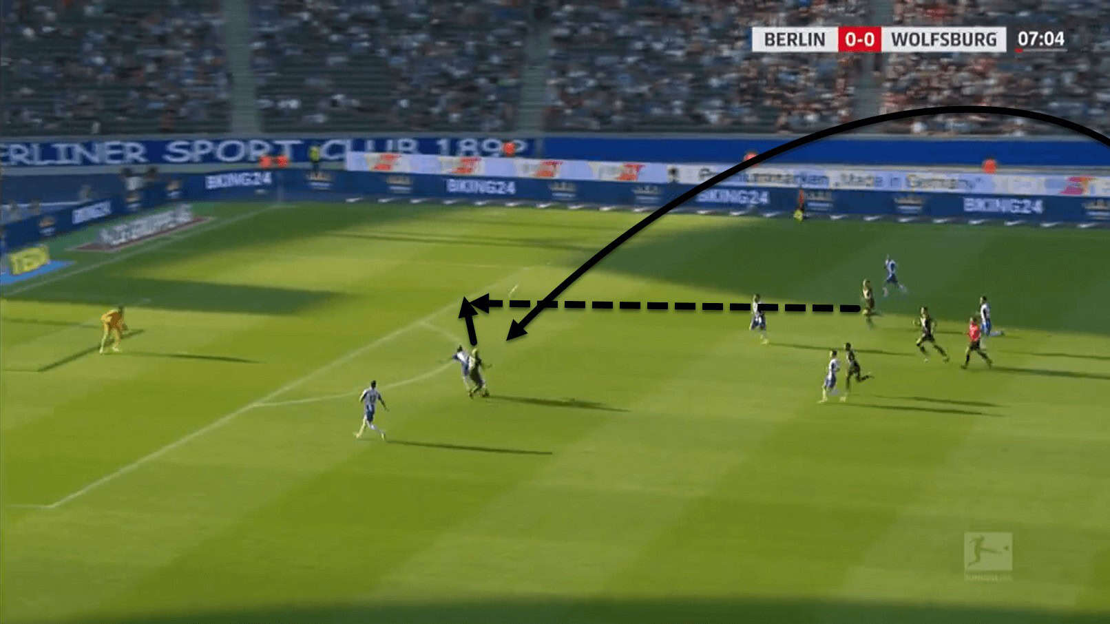 Pongračić begins to carry the ball forward on his own, this causes the opponent’s shape to stretch to try and stop the progressive carry. This, in turn, creates space for a pass into the centre to Arnold. Pongračić passes to him and then he can play a verticle pass to get the ball to the Wolfsburg forward men.