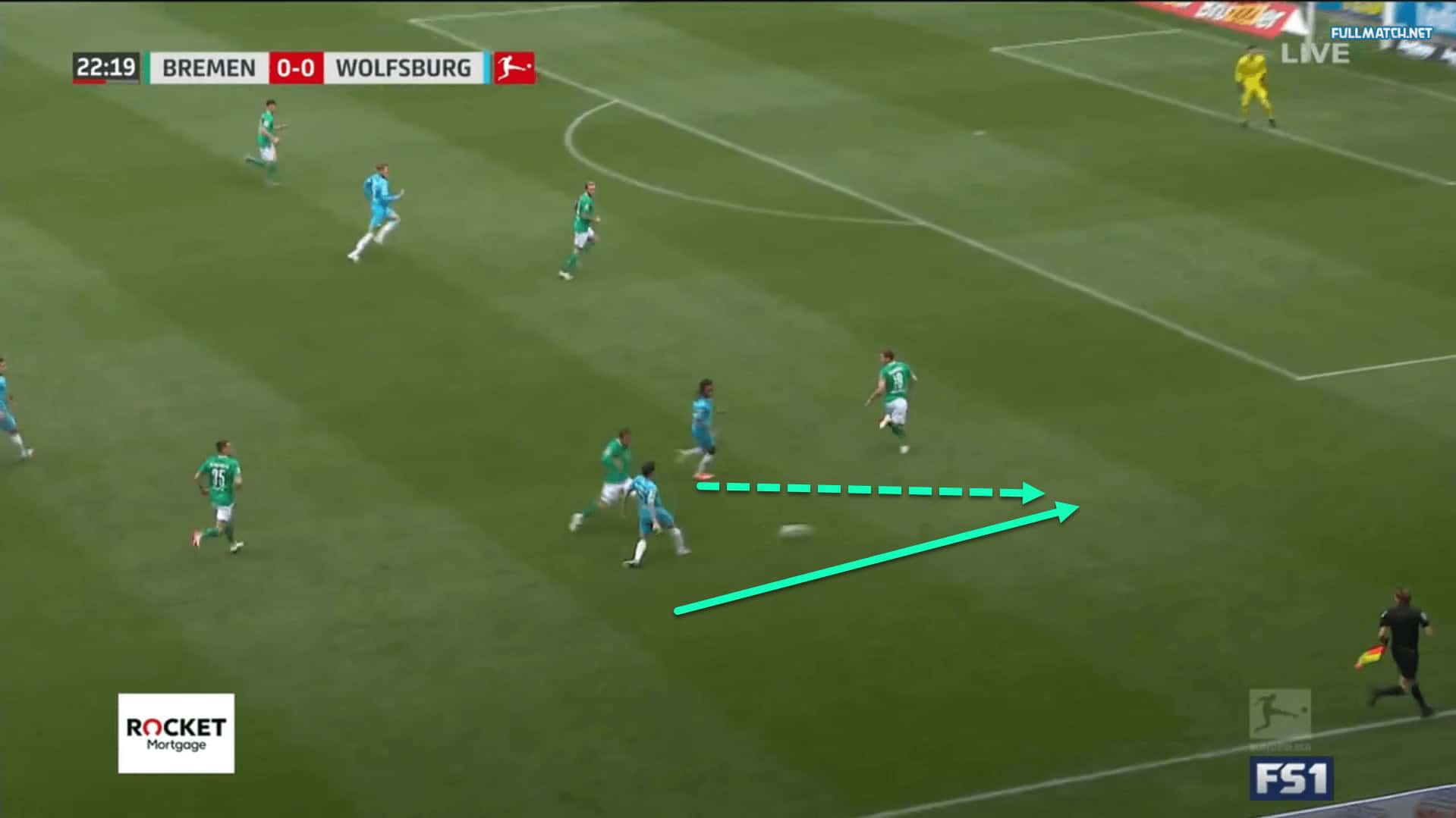 Wolfsburg 2019/20: Dynamic build-up strategies - scout report tactical analysis tactics In this image, we can see an underlapping run from the Wolfsburg wing-back, William. This allows him to run across the blindside of the opposition wing-back, meaning that the through ball on the flank from Knoche can find William in space on the right. He is then able to play a dangerous cross into Weghorst, however, a strong defensive header from the opposition centre-back stops the attack. The attacking full-back/wing-back was vital to building into the final third.