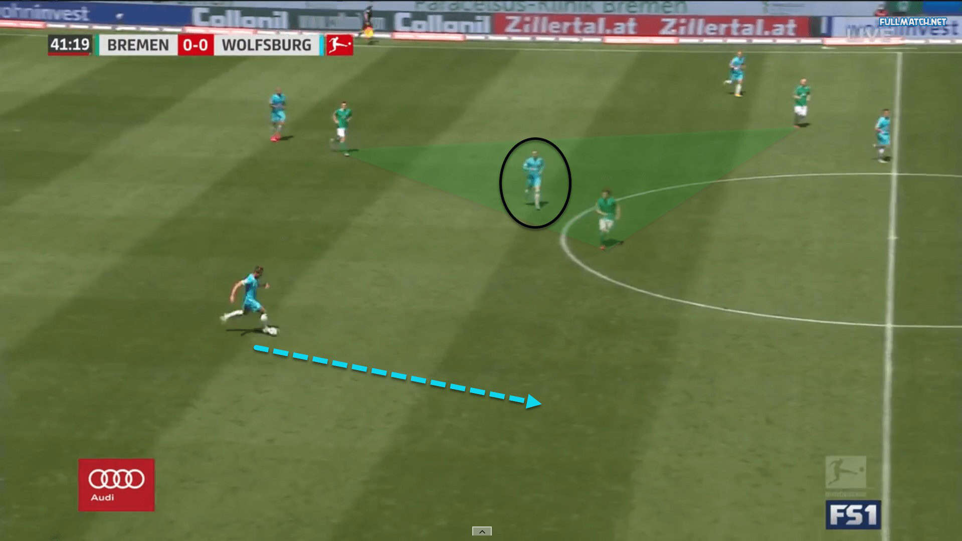 In order to bypass a defensive shape, where the opposition were looking to limit Wolfsburg’s central progression, Wolfsburg would bait a wide-press from the opposition in order to create space centrally for their midfielders, who can then receive possession and progress the ball centrally.