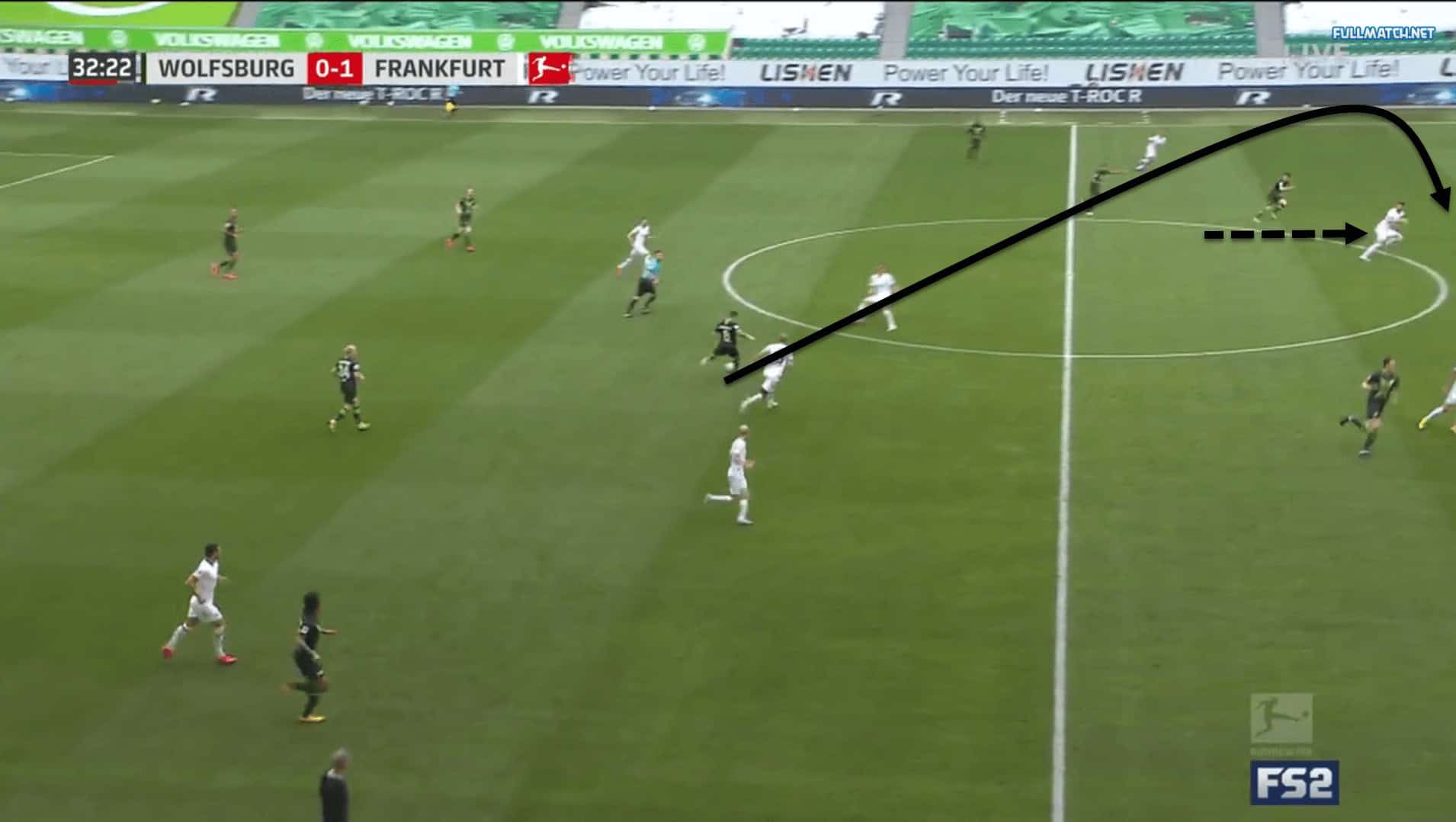 After Steffen receives the ball, his turn with his first touch is able to take two of Frankfurts players out of the game. His first reaction then is to play a direct lofted ball in behind the opposition defence towards Brekalo. The young winger is able to get a shot off but it is off-target. Again though, Wolfsburg were able to move the ball into a dangerous area with just two verticle passes.