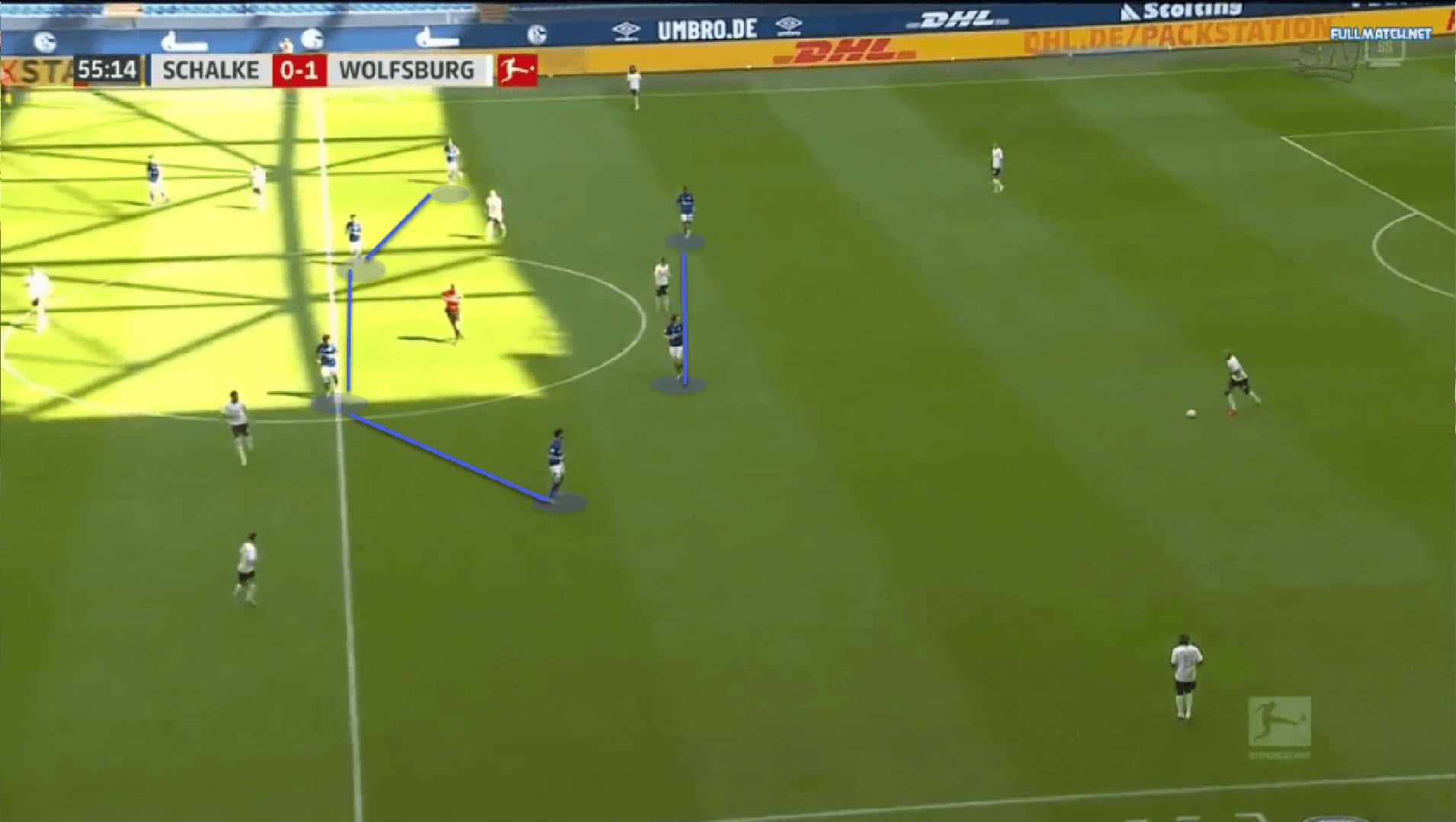 In this image, we can see that Schalke are operating in a narrow 4-4-2, this is done to try and limit central progression from Wolfsburg.
