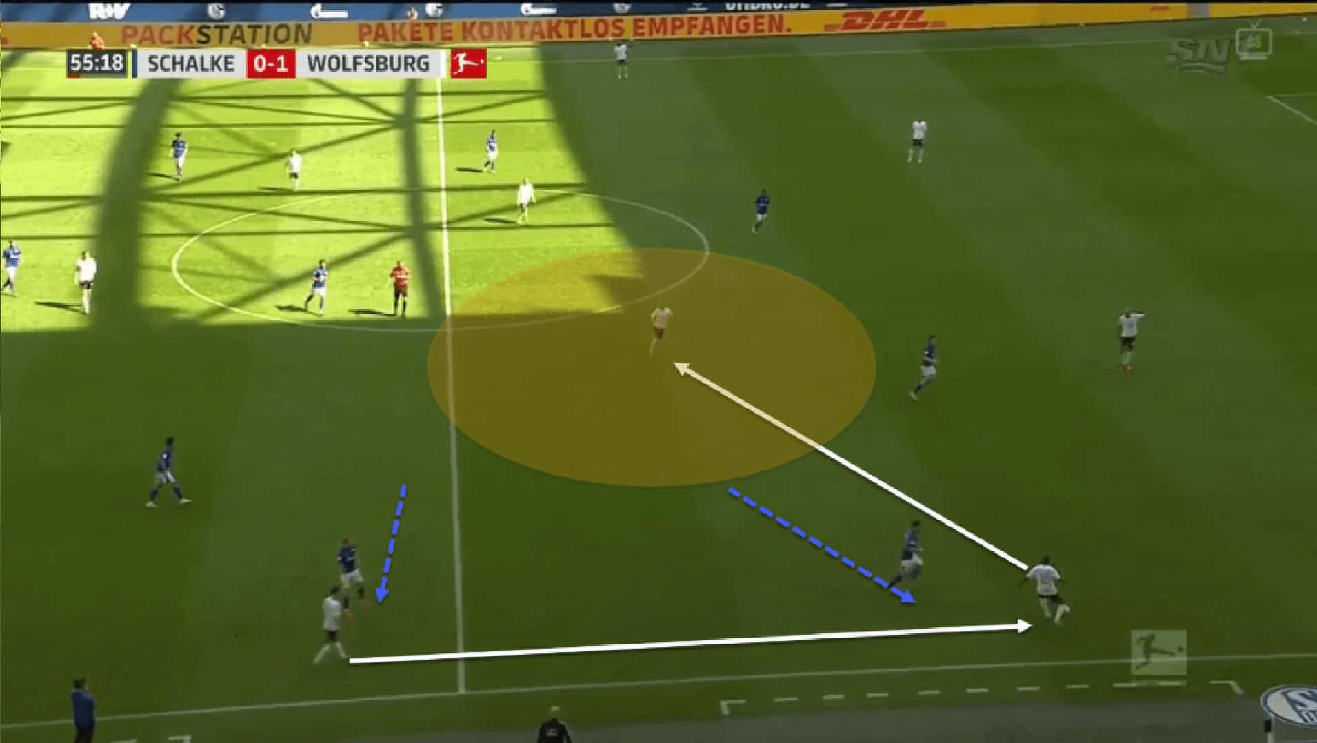 In order to bypass this, John Brooks moves the ball wide to Josip Brekalo, who then passes back towards Jérôme Roussillon. This circulation of the ball on the left-side is done to bait a wide press from Schalke. Once their settled, narrow shape is baited into the wide area, there is space in the centre for Arnold to receive the ball. He then passes across to Schlager and then two verticle passes lead to Wout Weghorst going through one-on-one with the goalkeeper and he manages to score.