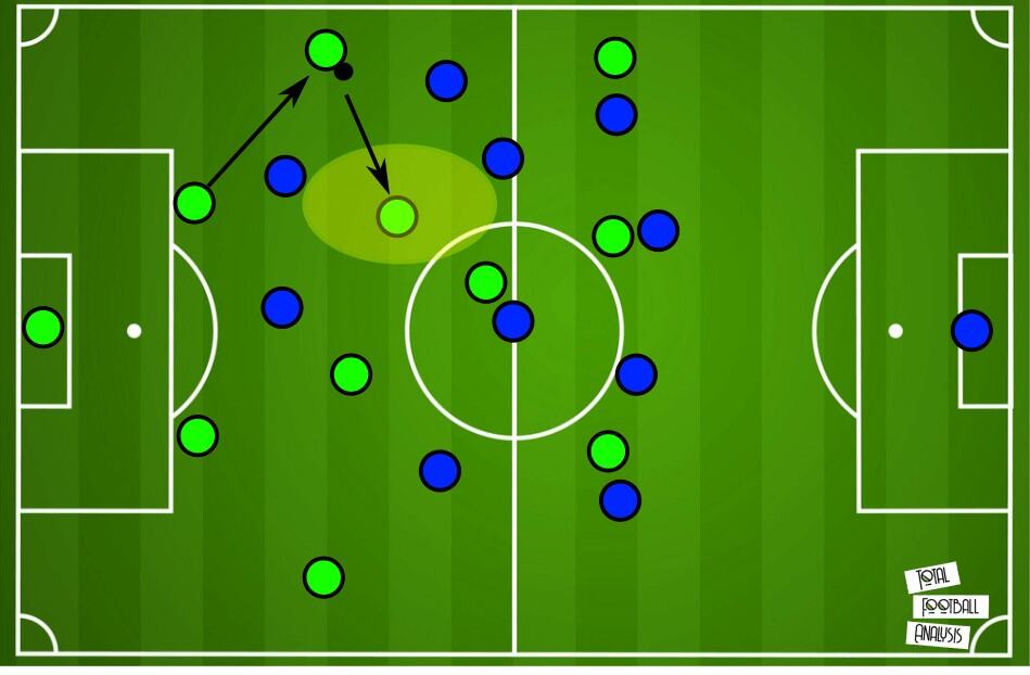 Although I mentioned that this strategy is mainly used when the opposition is not in a settled shape, Wolfsburg still sometimes use the strategy when teams are settled, with their defenders moving into the half-spaces.