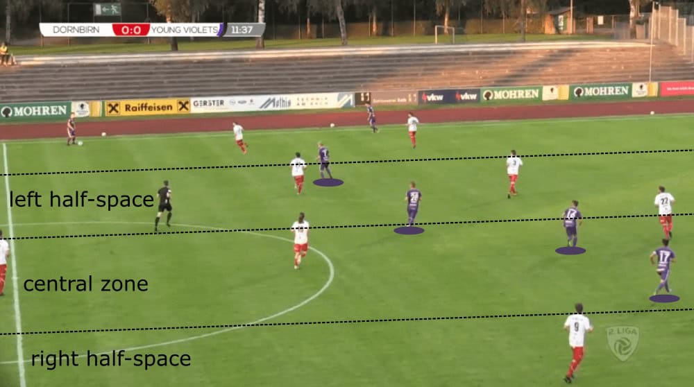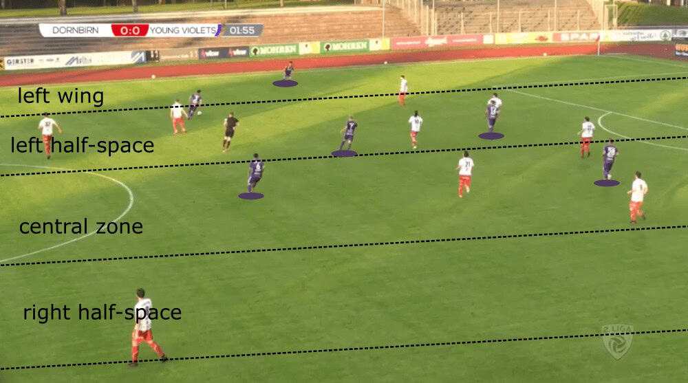In the next two chapters of this scout report, we will discuss the positioning of the players in the higher areas of the pitch. Basically, Suchard likes his players to overload the central areas between the opposition’s defensive line and midfield to have firstly enough men in the centre to create vertical passing lanes and secondly to force the opposition to defend very compactly and narrow what offers Young Violets space in the wide areas.