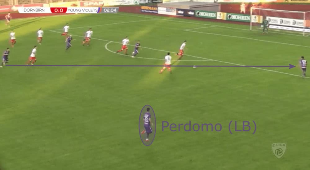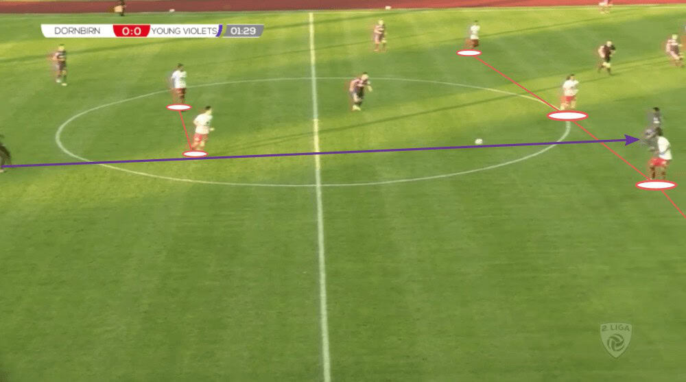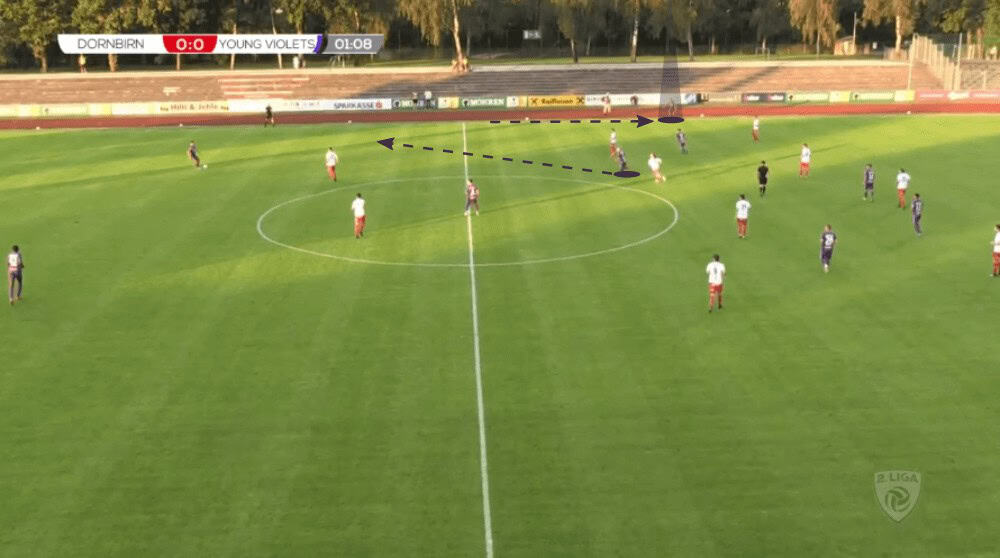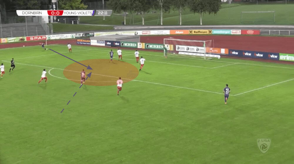 In the following example, the left-back Lukas Prokop pushes forward since the opposition sit back quite deep meaning that not necessarily both full-backs are needed for a save ball circulation. However, since both wide defenders (right-back out of the frame) are positioned very high, the two centre-backs and the defensive midfielder find themselves in a 3vs2 against the two strikers of Dornbirn in their 4-4-2. To give them one additional option, the central midfielder Matthias Braunröder comes deeper to help them.