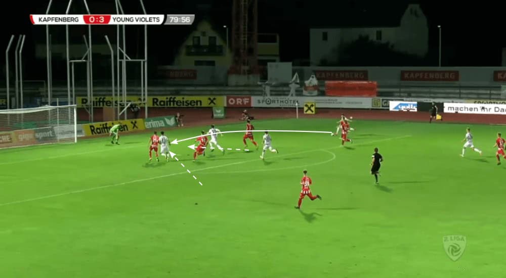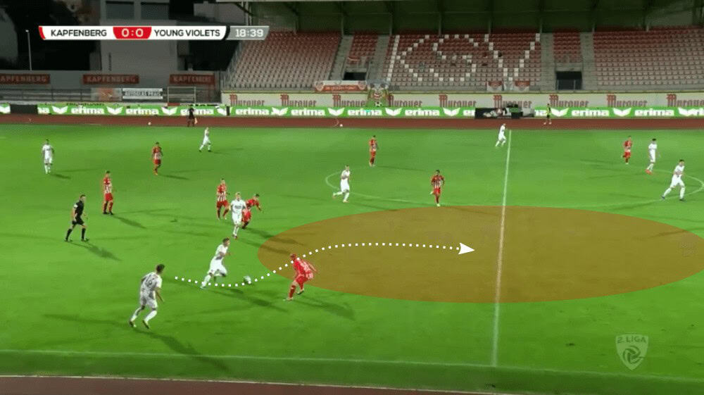 Additionally, the young men from Young Violets are encouraged to take on opponents in 1vs1 situations even in the own half as long as it gives the attack a massive boost when it is successful. Without any question this a central reason why they are behind FC Liefering the team with the second-most attempted dribbles per 90 minutes (on average 33.35).
