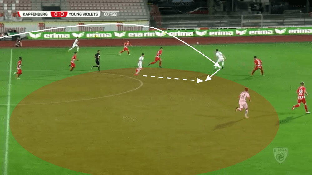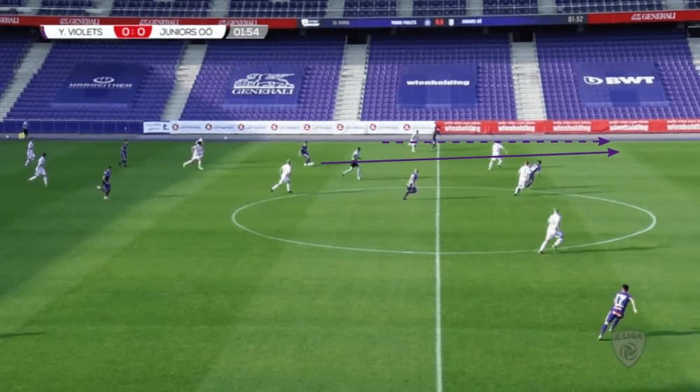 Such through passes as we can see in the example above are beside the low crosses the main way how Young Violets try to create goalscoring chances in the final third. Such low crosses are also often used by EPL giants Manchester City, for example. The former Bayern Munich and Barcelona coach Pep Guardiola encourages his players to break through on the wings to then deliver low-driven crosses.