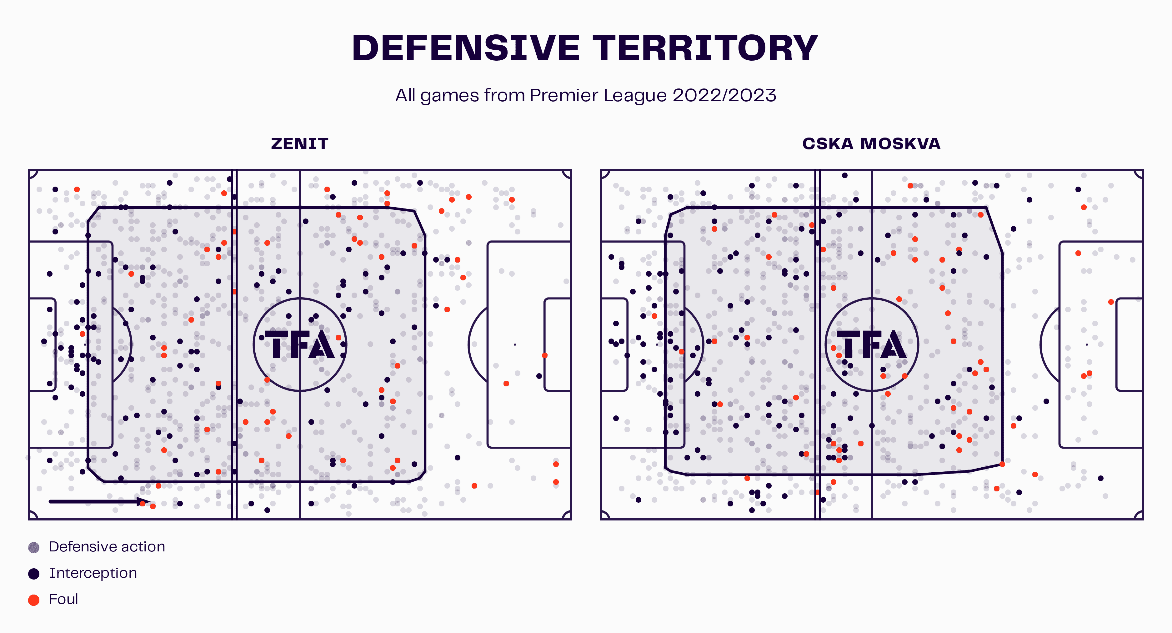 As we can see from this data viz, Zenit are pressing high up the pitch as the team’s average defensive line height is just below the centre circle. However, the defensive line still isn’t as high as CSKA Moscow who are second in the Russian top-flight right now.