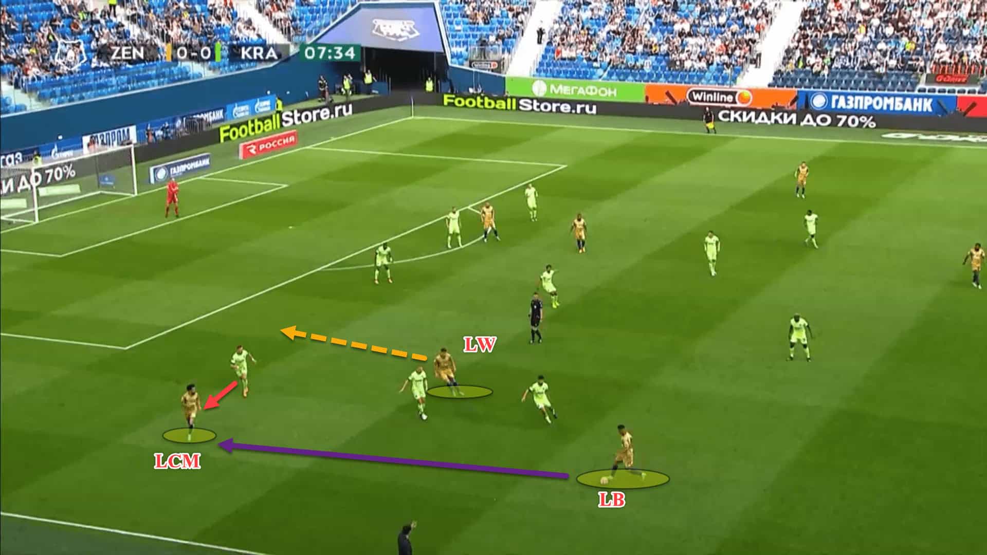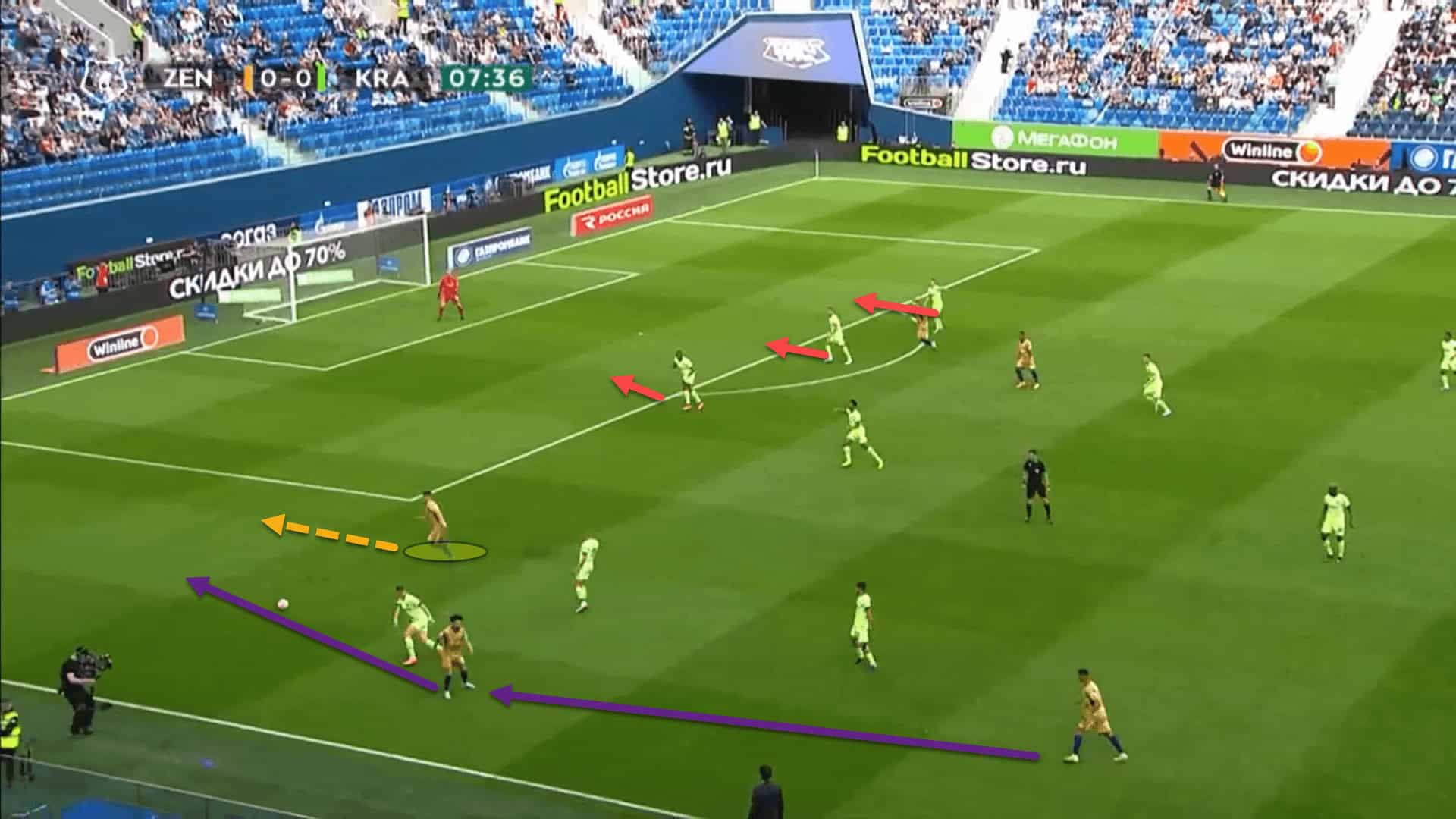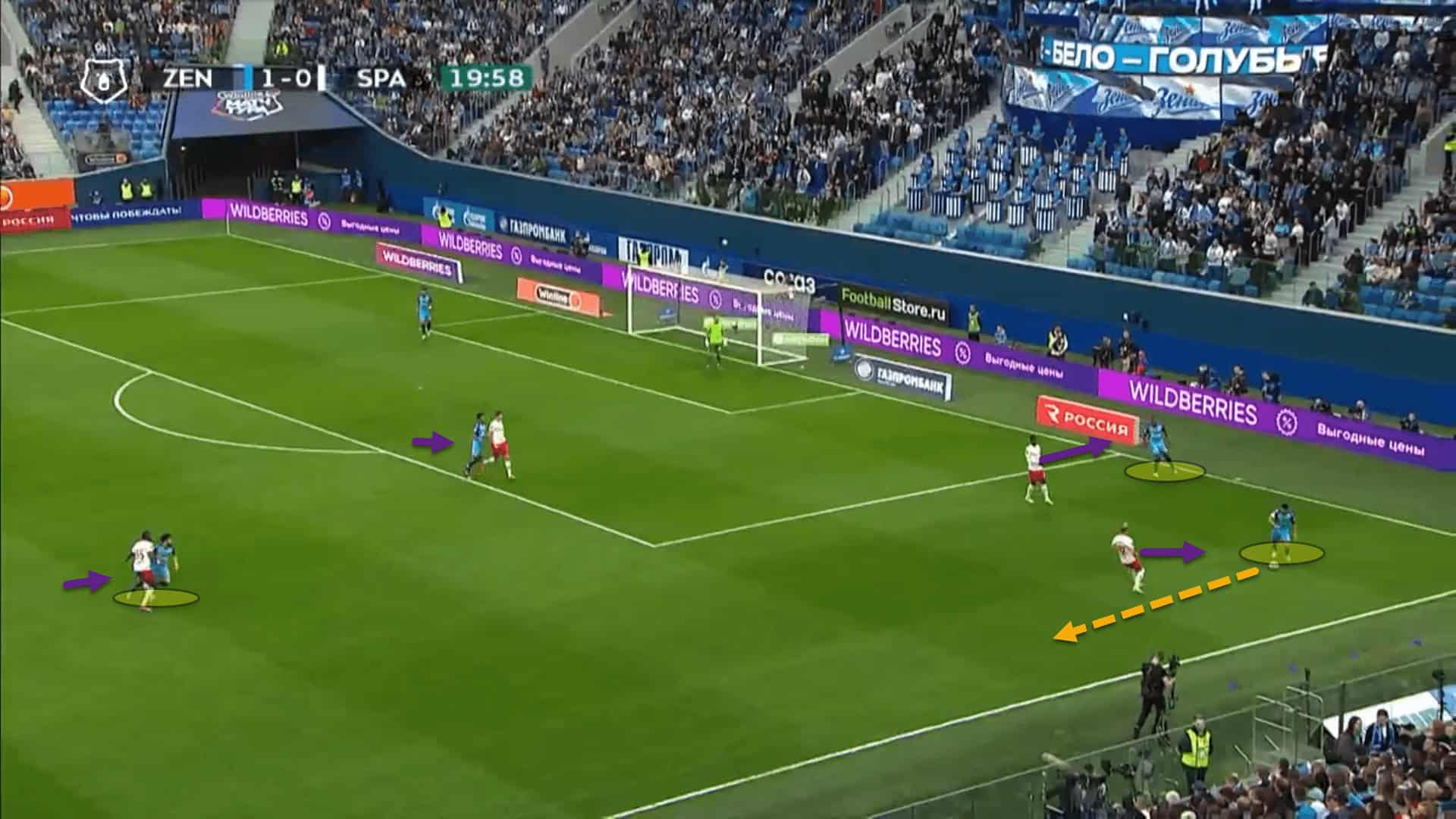 For instance, here, Zenit have created an overload out on the right flank with both wingers on the same side of the pitch rather than having the two wingers fixed on their respective flanks. Mostovoy has came all the way across from the left to the right to join the overload.