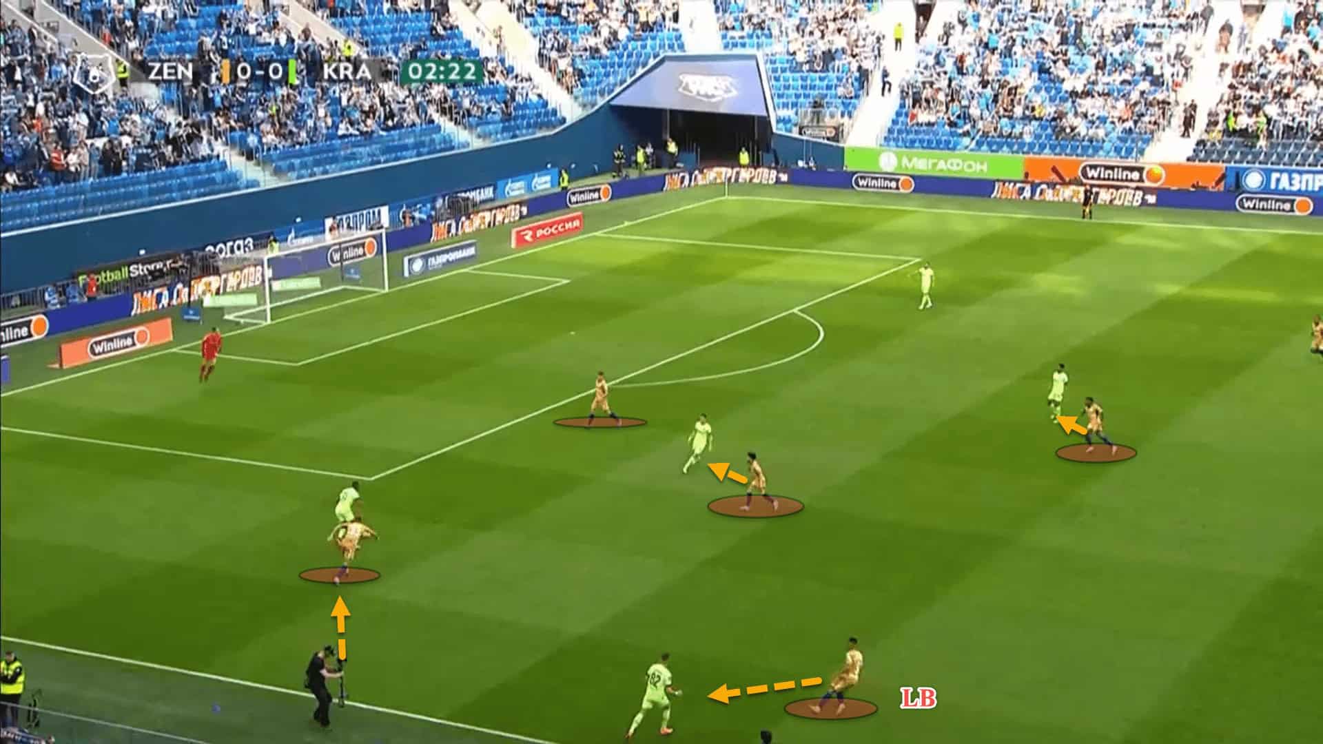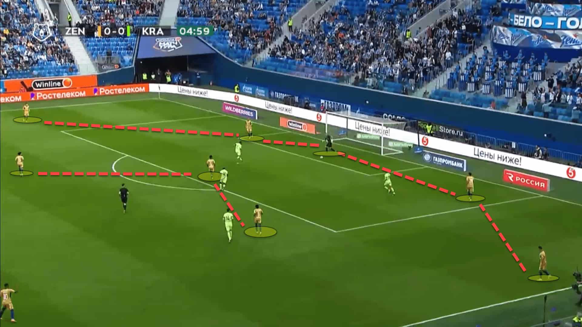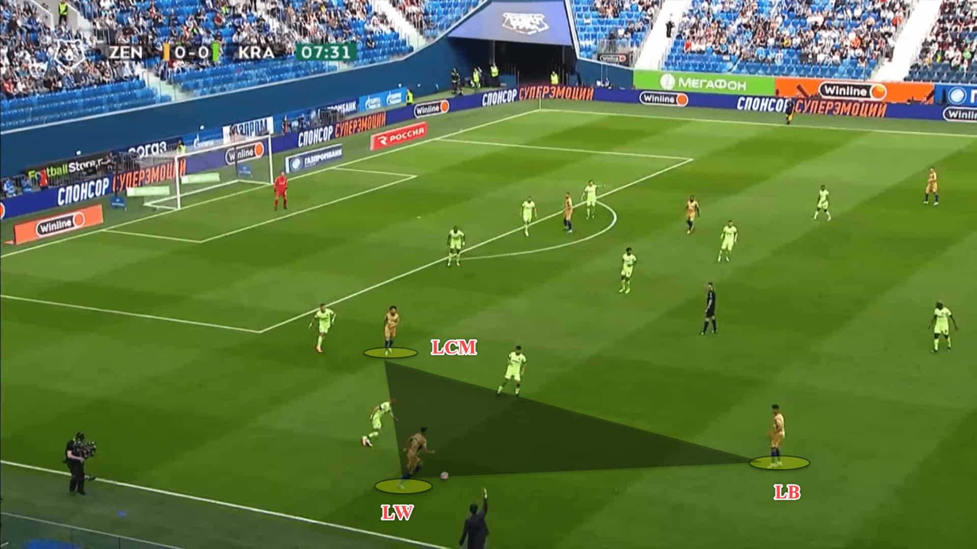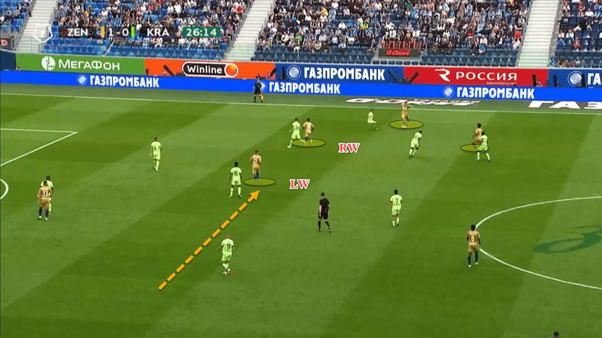 For instance, here, Zenit have created an overload out on the right flank with both wingers on the same side of the pitch rather than having the two wingers fixed on their respective flanks. Mostovoy has came all the way across from the left to the right to join the overload.