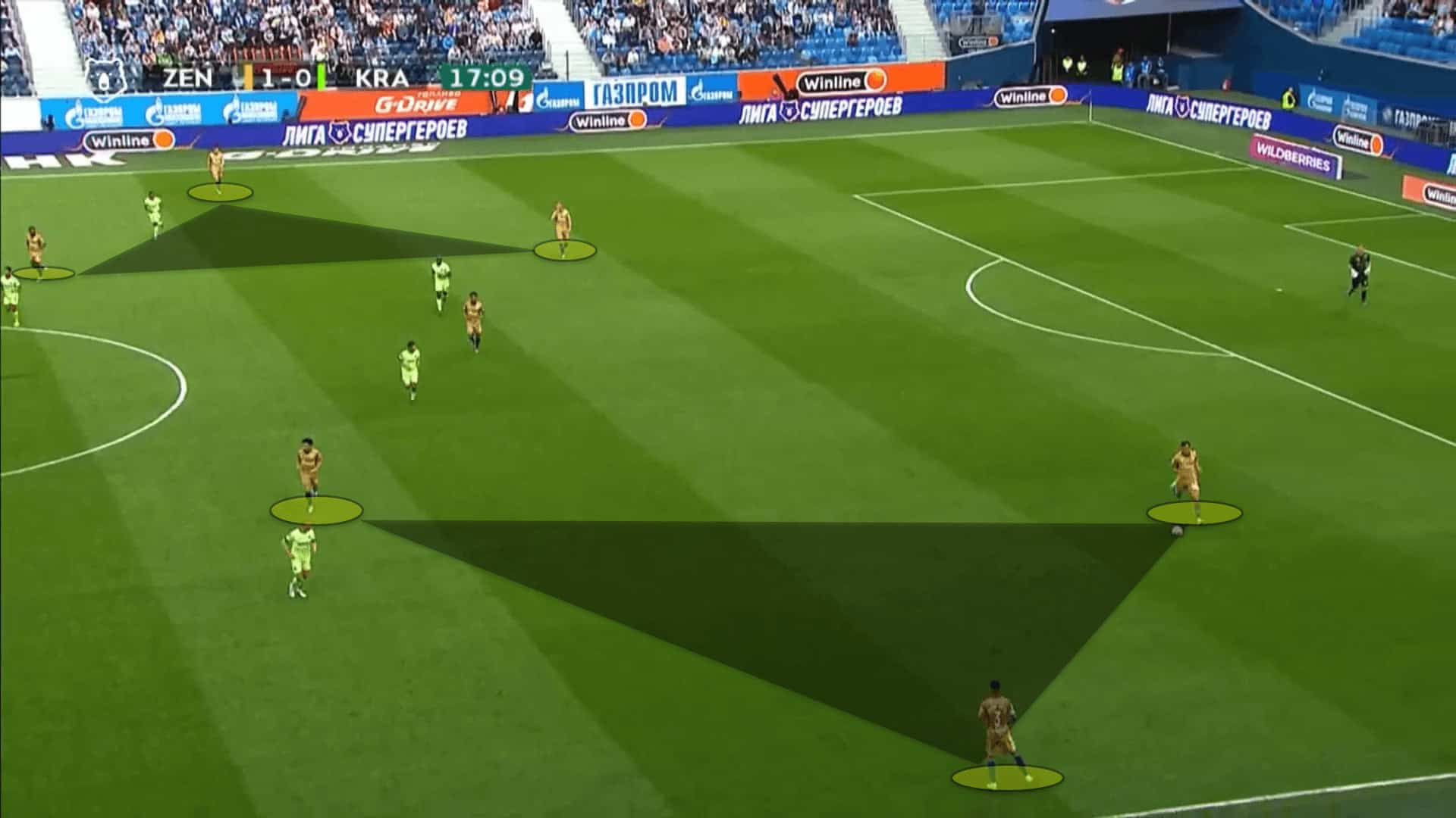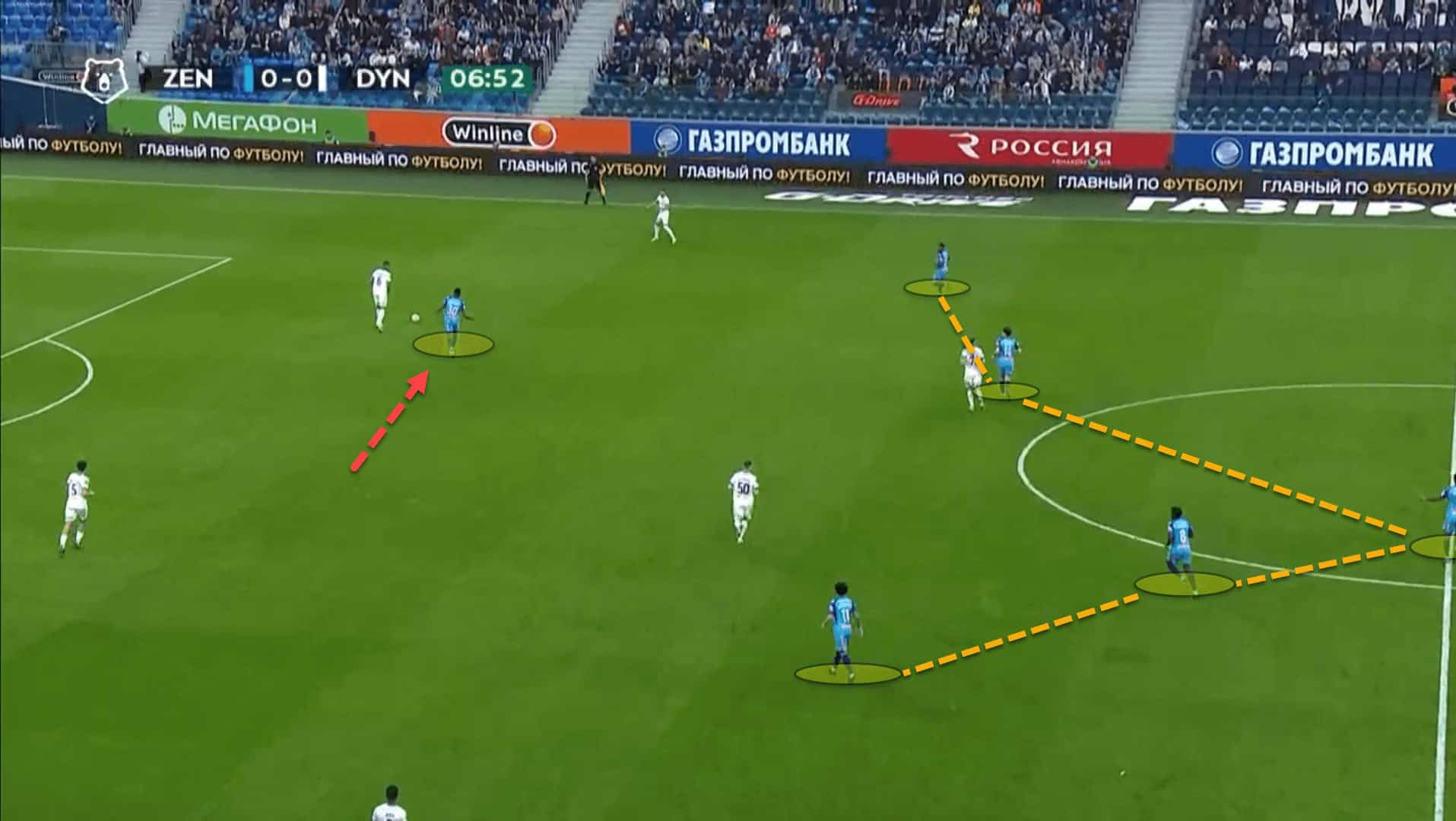 One of the prefixed principles imposed by Semak and his coaching staff is how Zenit’s players make halfspace runs in behind the opposition’s backline. This is done through the employment of wide triangles.