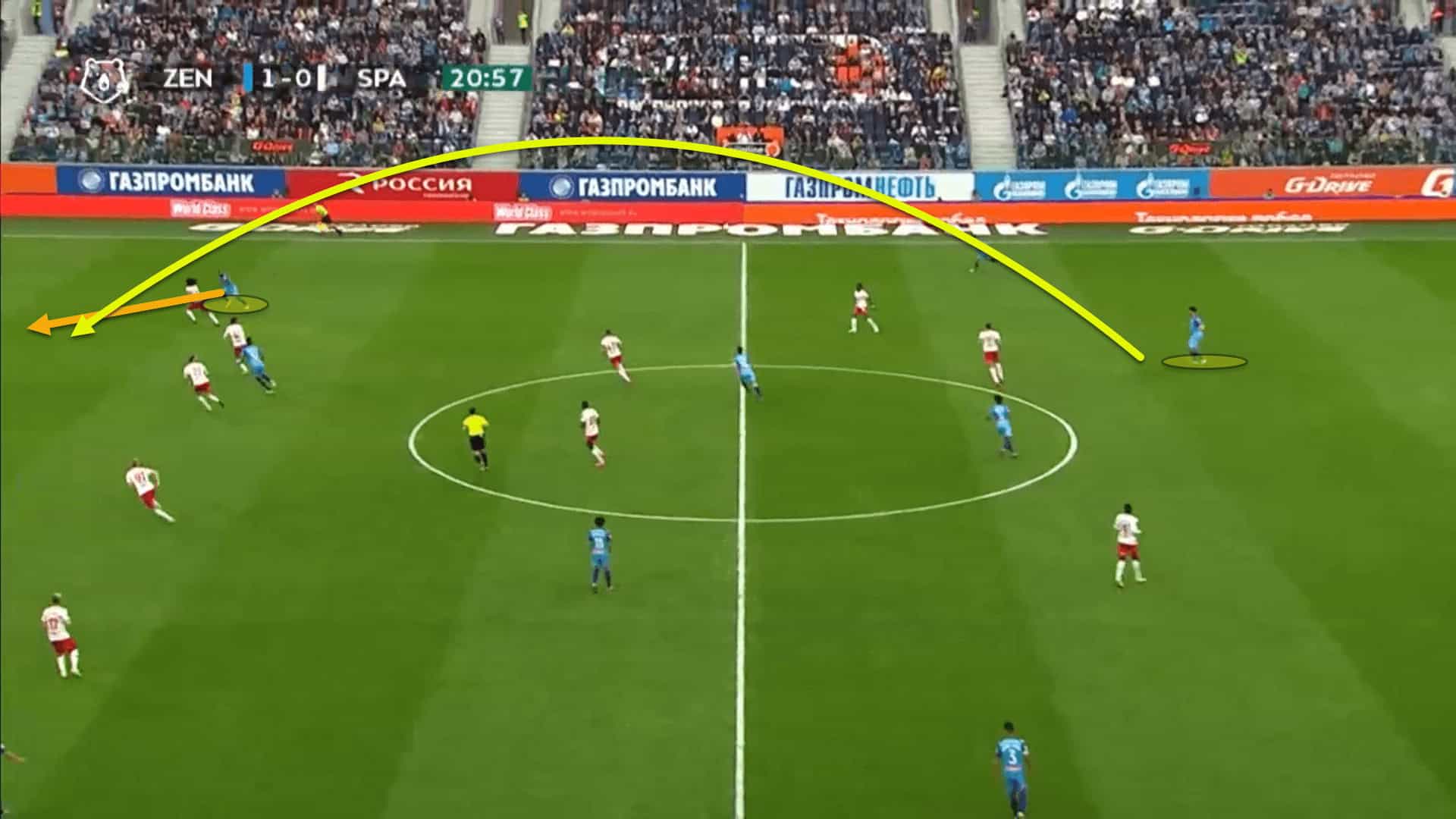 Things don’t always need to be this manufactured, though. At times, when the defending team are sitting in a mid-block with a relatively high defensive line, it is perfectly common for Zenit to use the diagonal runs of their wingers in behind to try and get in on goal.