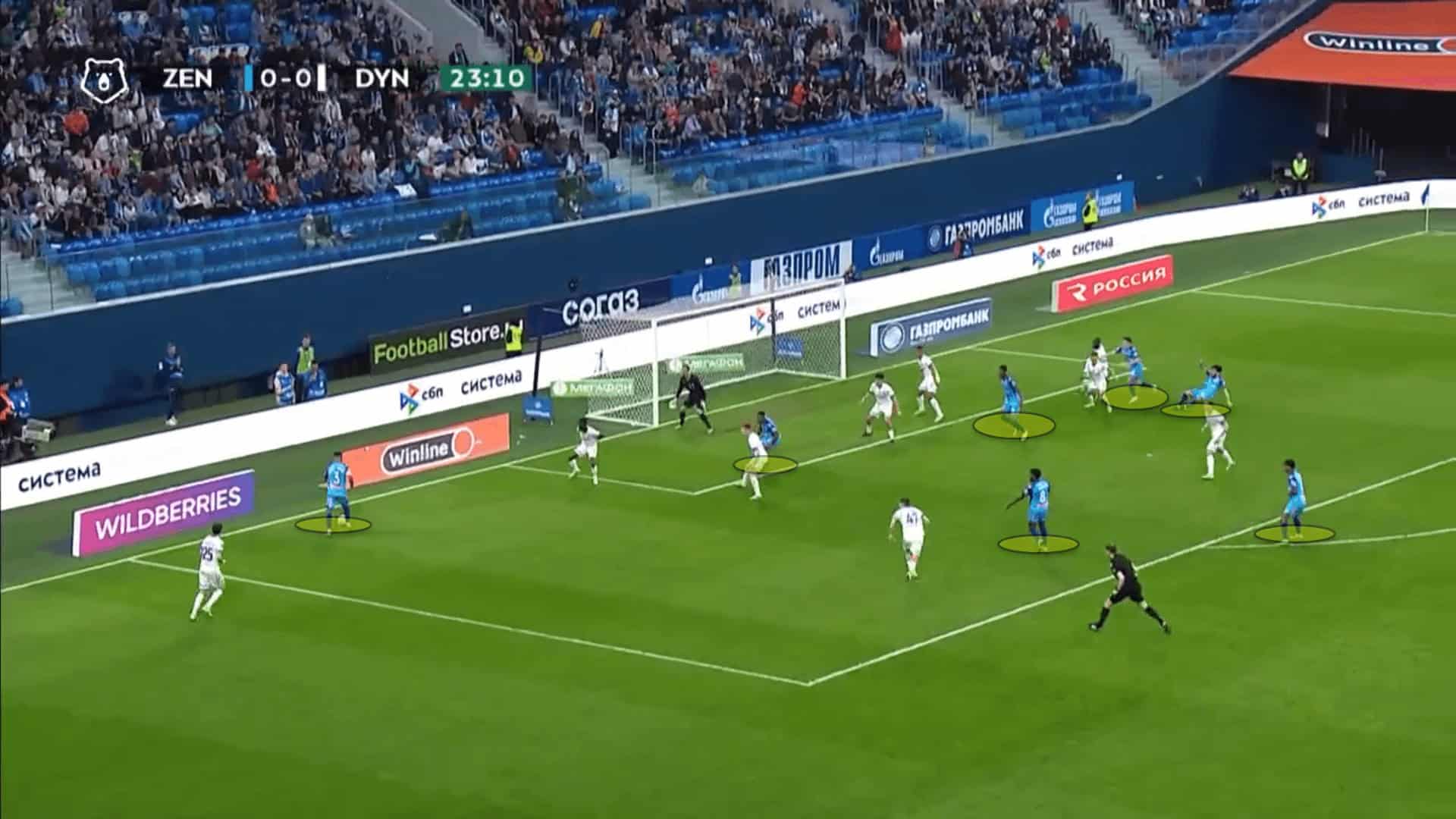 The objective of Zenit’s attacks is to get into decent crossing positions to put the ball into the box. When the ball is ready to be whipped in, the Russian giants pack the box with numerous bodies.