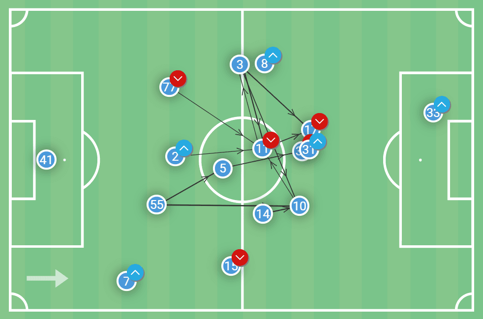 In the opposition’s half, these triangles primarily comprise the nearest winger, fullback and central midfielder. In the previous example, the left-winger was hugging the touchline, the left-back was sitting at the base of the triangle while the ball-near central midfielder was sitting in the halfspace.