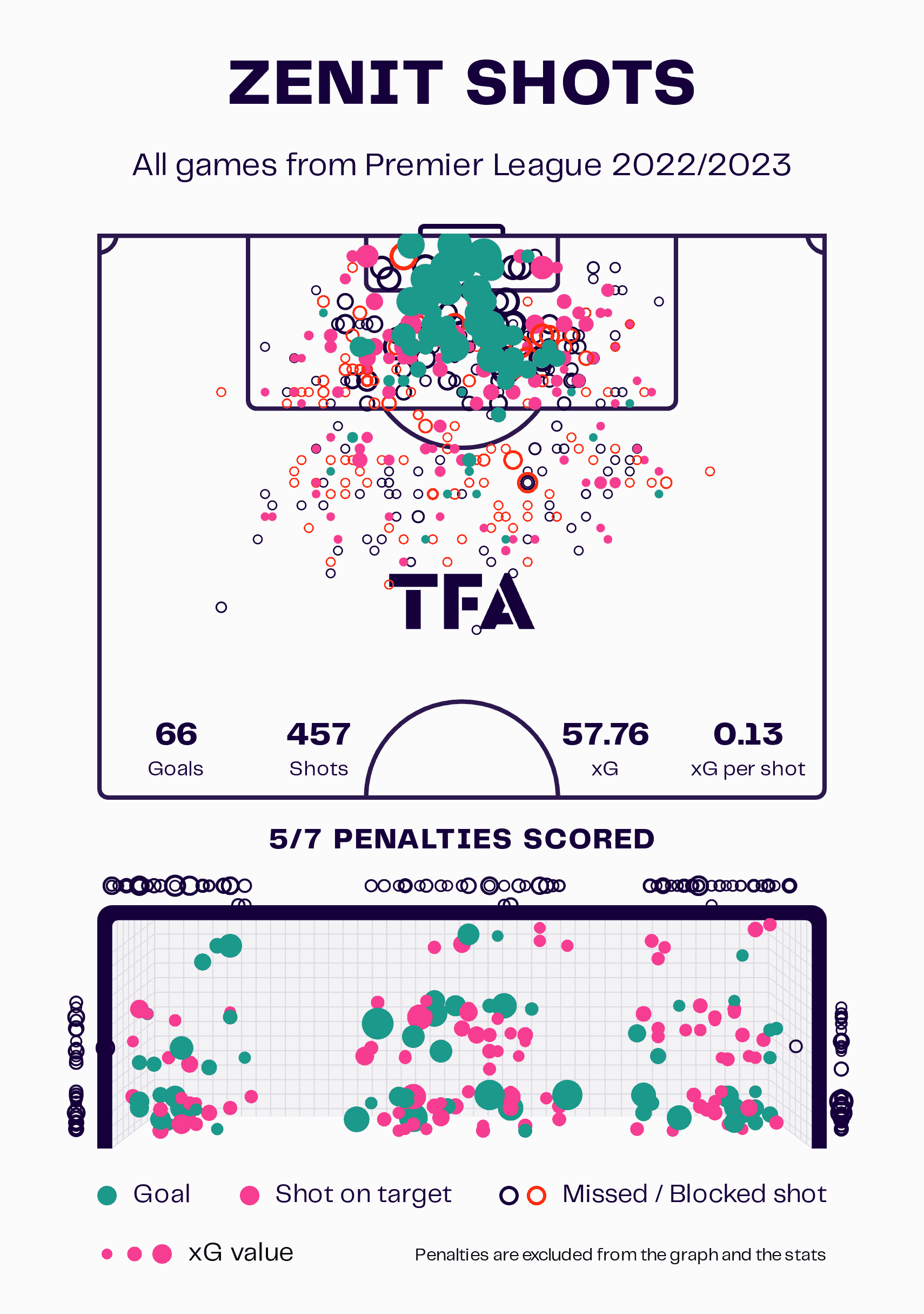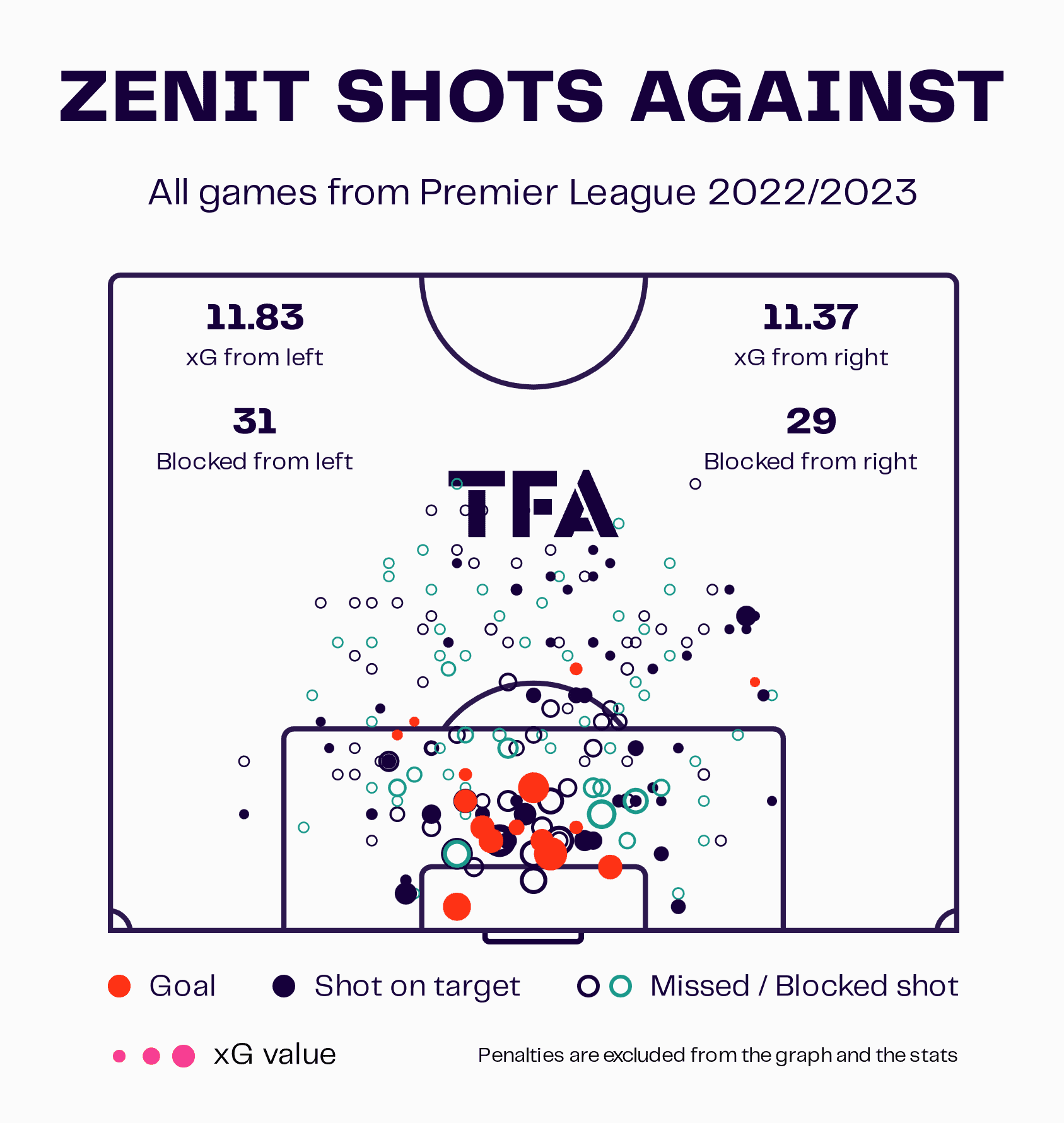 This graph, which excludes the own goal, highlights just how good the champions have been in front of goal as Zenit are outperforming their non-penalty xG of 57.76, scoring 66 non-penalty goals.