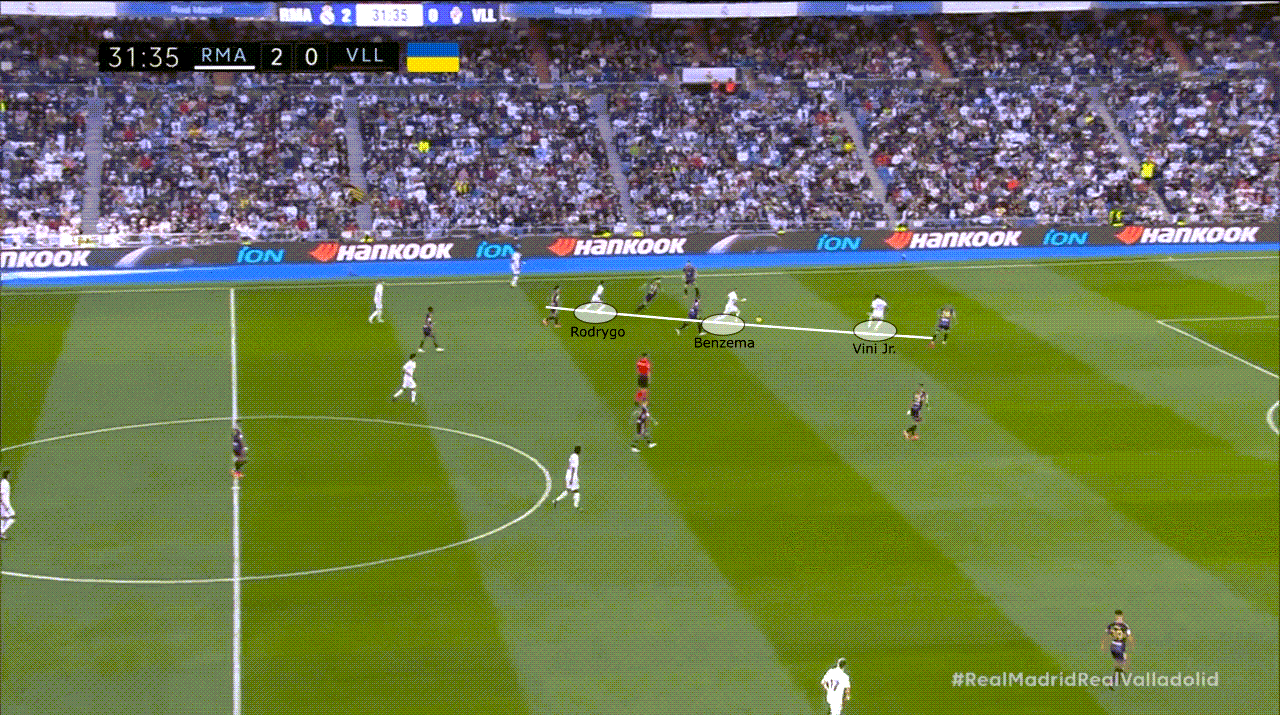 Here, Rodrygo has come across to the left and has linked up with Karim Benzema and Vini Jr rather than holding his position on the right-hand side.